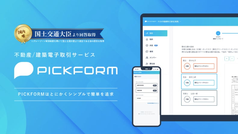 そんな中、国内で唯一国土交通大臣より適法である旨の回答を受け、複雑な宅建業法を遵守して運用ができる(※2)不動産・建築DXプラットフォーム「PICKFORM 電子契約」をご採用いただく運びとなりました。PICKFORMは、今後も様々なアップデートを、不動産取引に特化して改良していく予定であり、中長期的にもお付き合いしていただけるパートナーとしてご採用いただく形となりました。