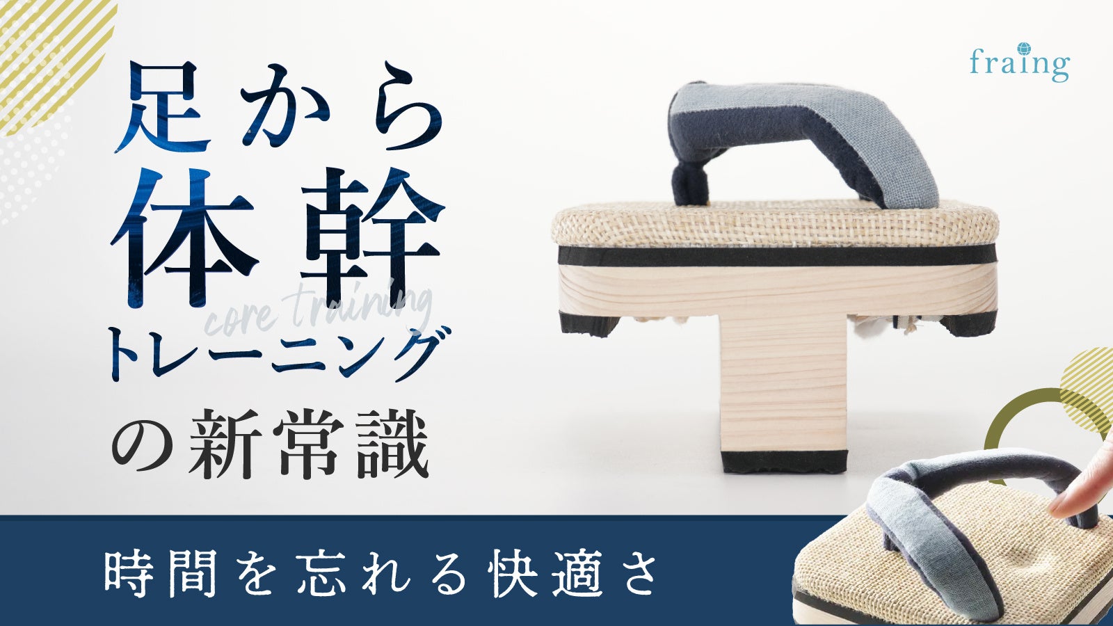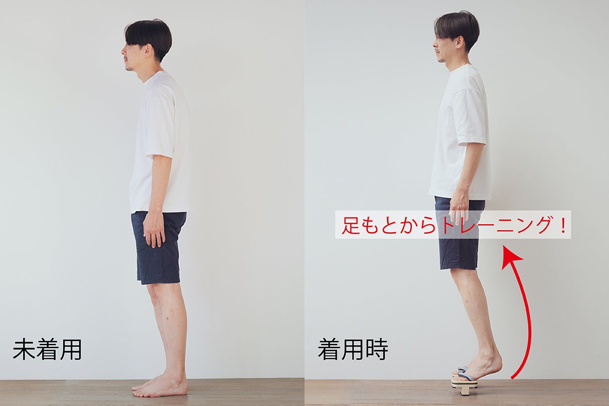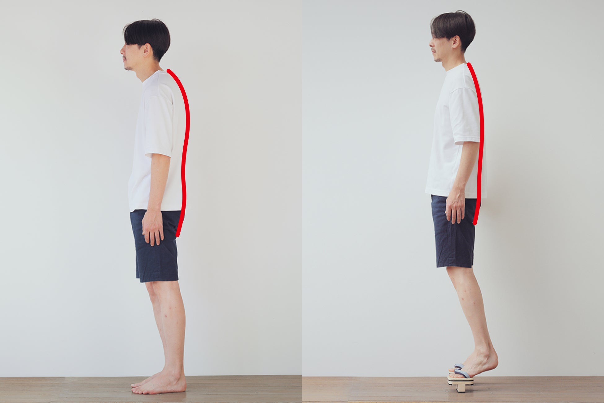 一本歯下駄HANBUN-fraing-を履いてみると、普段の姿勢との変化を感じていただけると思います。これは履くことによってバランスが不安定な状態になるため、無意識に体幹を使い姿勢を保とうとすることで自然と理想的な立ち姿になるからです。
