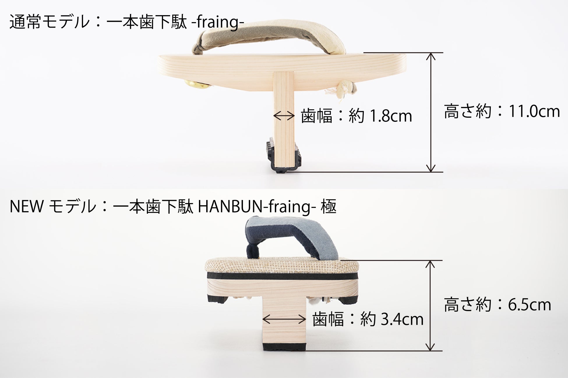 2023年に発表し大反響をいただいた前回モデル「一本歯下駄HANBUN-fraing-」のユーザー様から頂いたご意見をフィードバックし、完成したのが、今回のニューモデル「一本歯下駄HANBUN-fraing-極」です。