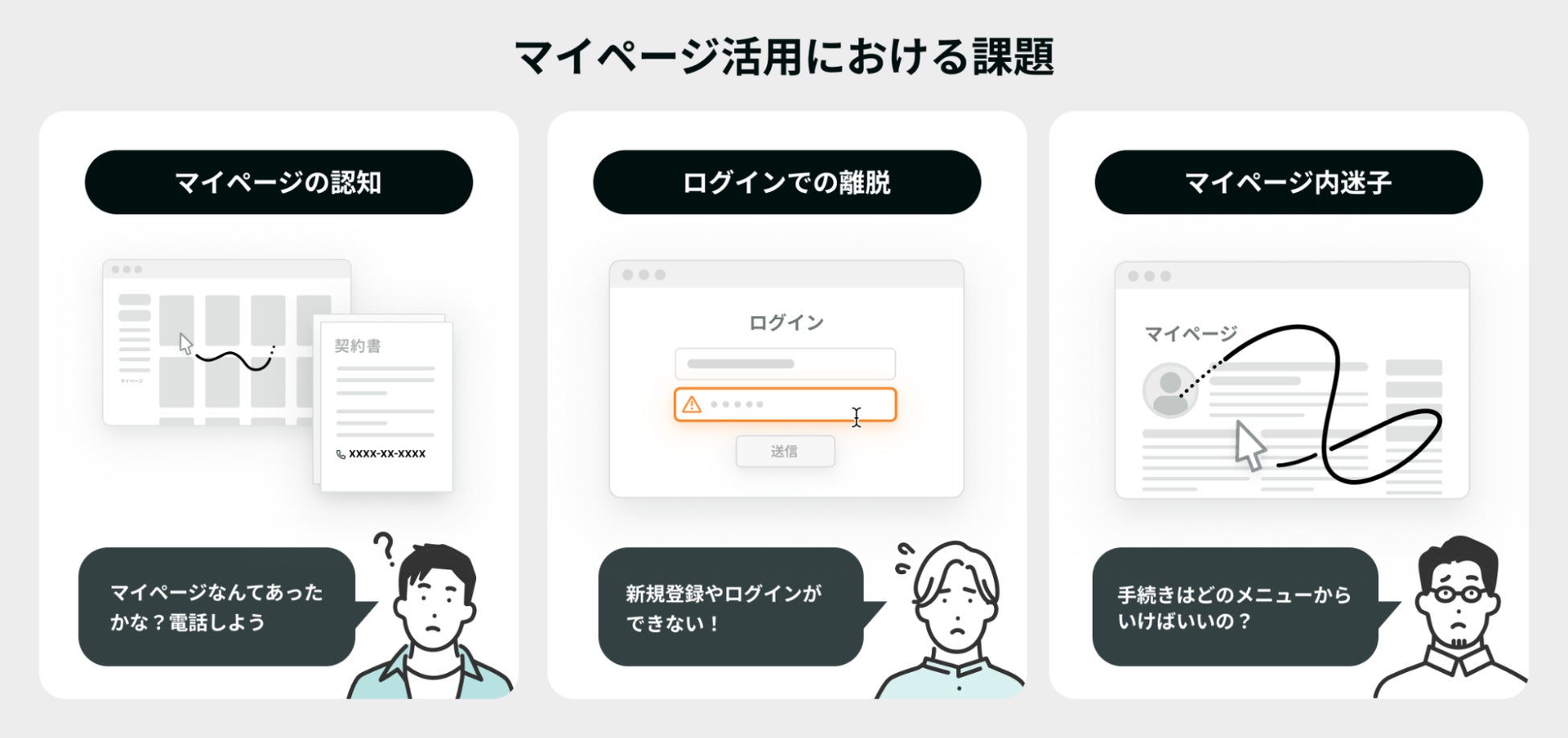 同社は、お客様の利便性向上を目指し、Web上の「マイページ」で利用できる保険の手続きの種類を拡充するため新たなマイページのシステム開発を実施しました。しかし、当初想定していたマイページへの登録者数や保険手続き件数が伸び悩んでいる状況でした。Webサイトにくるお客様のお困りごとへの推測や仮説はあったものの、実際にお客様がどの画面で離脱しているのかなど、ユーザー行動を把握する手段がなく、効果的な改善策を講じることができませんでした。