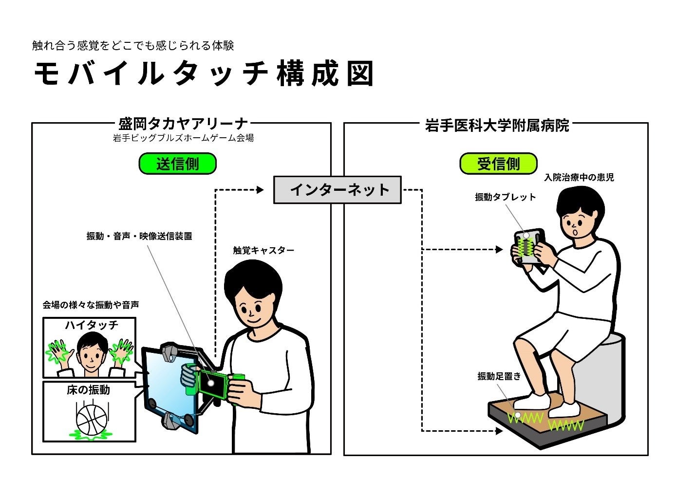 岩手医科大学附属病院から退院し、サポーターとしてチームに入団している高校生 (当時)が「触覚キャスター」として、岩手ビッグブルズの選手とコミュニケーションを行います。同病院小児病棟に入院治療中の患児達へ、その時の映像や音声にくわえて、高校生の持つデバイスに選手が触れた触感が、手元や足元の振動としてリアルタイムに伝わります。