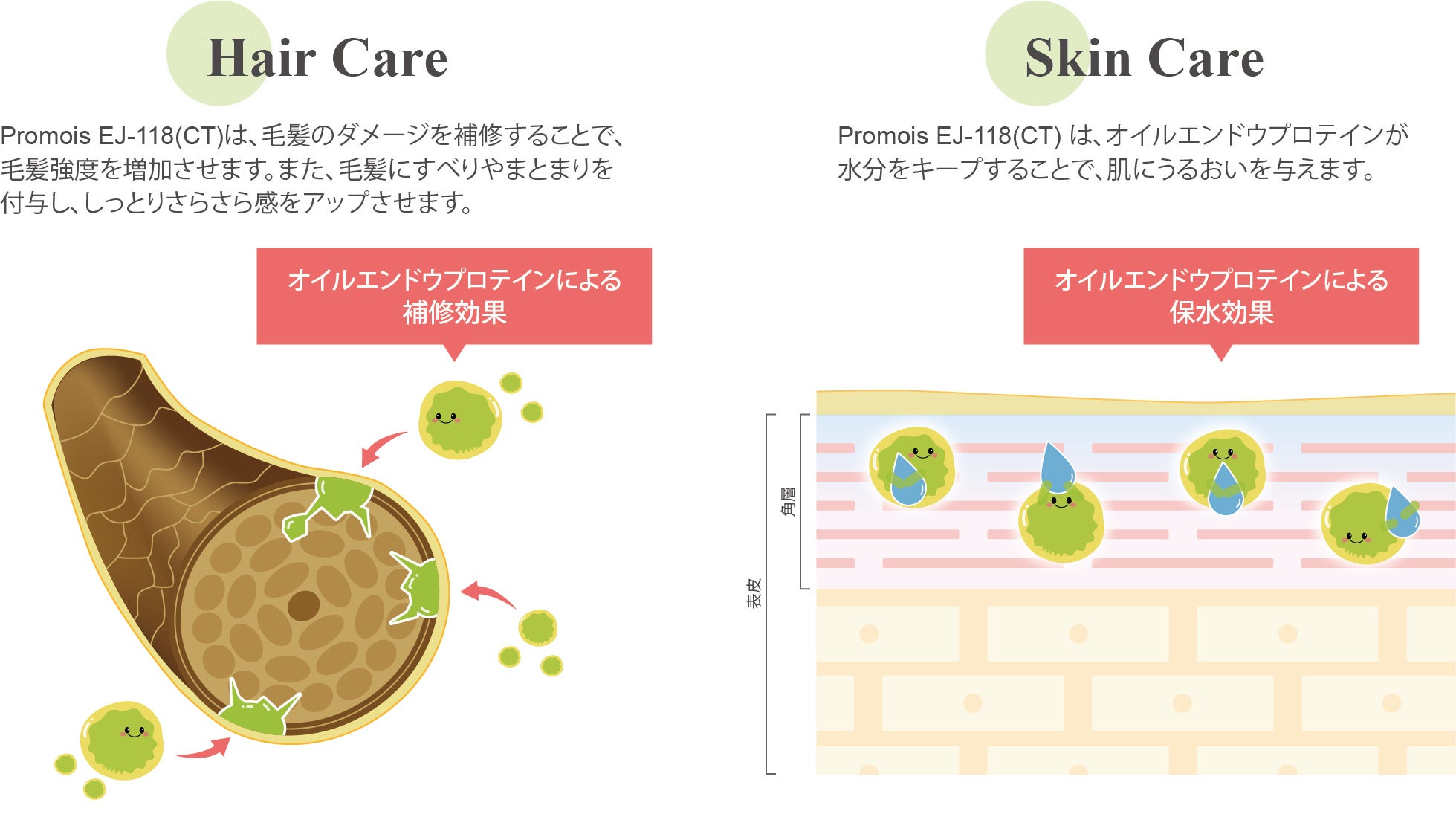 また、Promois EJ-118(CT)は、毛髪にはハリ・ツヤとしなやかさを付与し、肌にはうるおいを与えて水分保持をサポートする多機能原料であるため、ヘアケアとスキンケアの両立、幅広い処方設計を可能にします。
