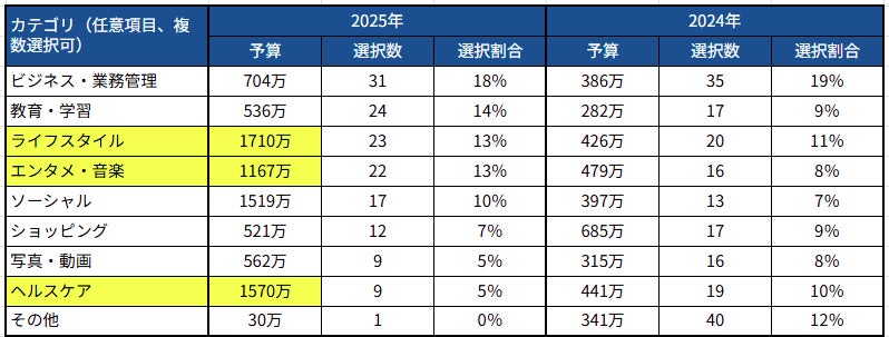カテゴリ別では、特筆してエンタメ・音楽(平均1,167万円)やライフスタイル(1,710万円)系が高単価化。一方で、ビジネス・業務管理系も依然として最多カテゴリー(全体の18%)を維持しつつ高単価化されているので、特定のカテゴリで予算が増えた、というよりは全体的に底上げされている傾向です。