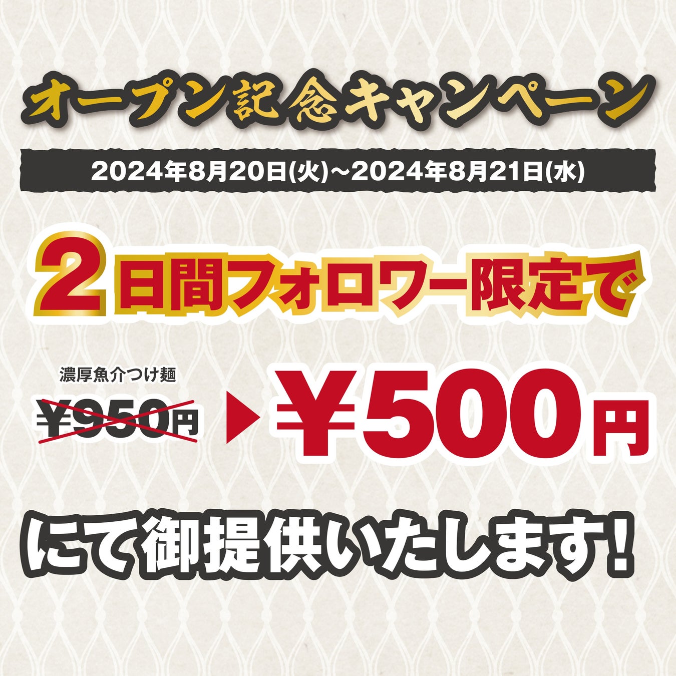 Instagram公式アカウントをフォローした方限定で、2024年8月20日(火)~2024年8月21日(水)の2日間で「濃厚魚介つけ麺」をワンコイン500円でプレゼント!