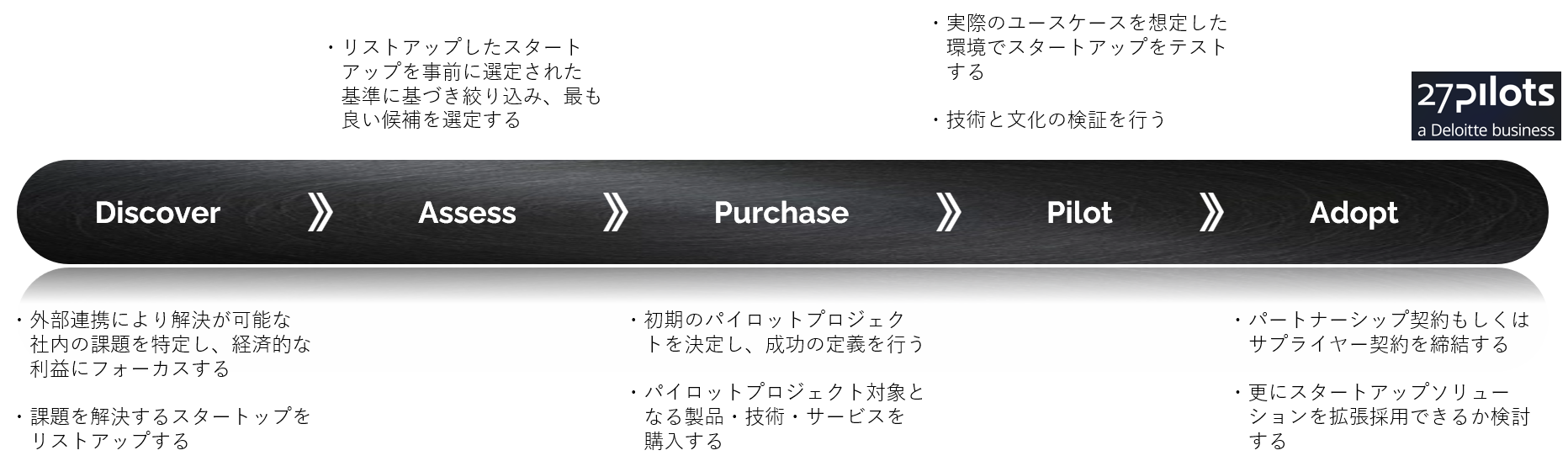 VCM(ベンチャークライアントモデル)とは世界最高峰のスタートアップの顧客になり、スタートアップの技術力やサービスなどを自社の収益向上、コスト削減などの戦略的利益のために活用することを再現性を持って実現する方法です。27pilots のCEOであるグレゴール・ギミー氏がBMW 在籍時に、BMW Startup Garage の取り組みを通して得たスタートアップとの協業の概念を再現性のある形で定式化したのが起源とされています。日本では、デロイト トーマツ ベンチャーサポート株式会社が27pilotsと協業し2023年12月より導入サポートサービスの提供を開始しており*、同社のCOOである木村将之氏が27pilotsのJapan Country Headを務めています。