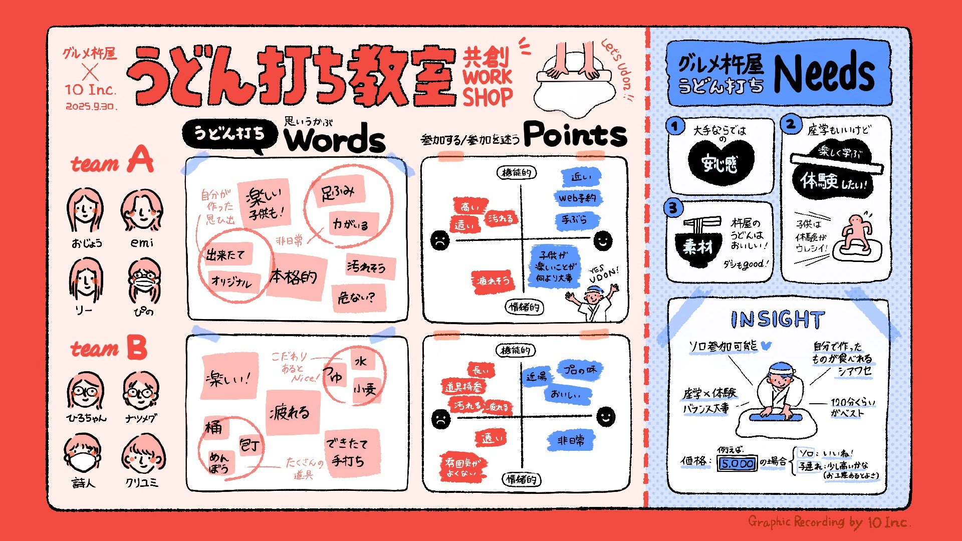 株式会社10(本社:東京都中野区、代表取締役 佐藤尊紀、以下10 Inc.)は、株式会社グルメ杵屋(本社:大阪市、代表執行役社長:椋本充士)が新たに取り組む「杵屋 うどん打ち体験プログラム」開始に際し、生活者の声をもとにプログラムを検討する共創ワークショップを実施いたしました。