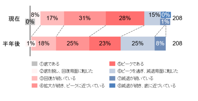 半年後においても、過半は同様のマーケット見通しを示しているが、縮小に向かうという見方も拡大している