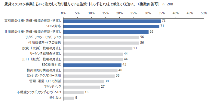 賃貸マンション事業のトレンドは、リモートワーク定着による「専有部共用部の仕様・設備・機能の更新・見直し」や、社会や投資家などのステークホルダーから企業への強い要請である「 SDGs/ESG 投資対応」への注力が見受けられ、課題としては、「SDGs ・ ESG 投資対応」、「管理・運営コストの削減」、「付加価値サービス・ DX 対応・ブランディング」による差別化、「投資 出口 リーシング戦略の見直し」など多岐に渡った結果となりました。
