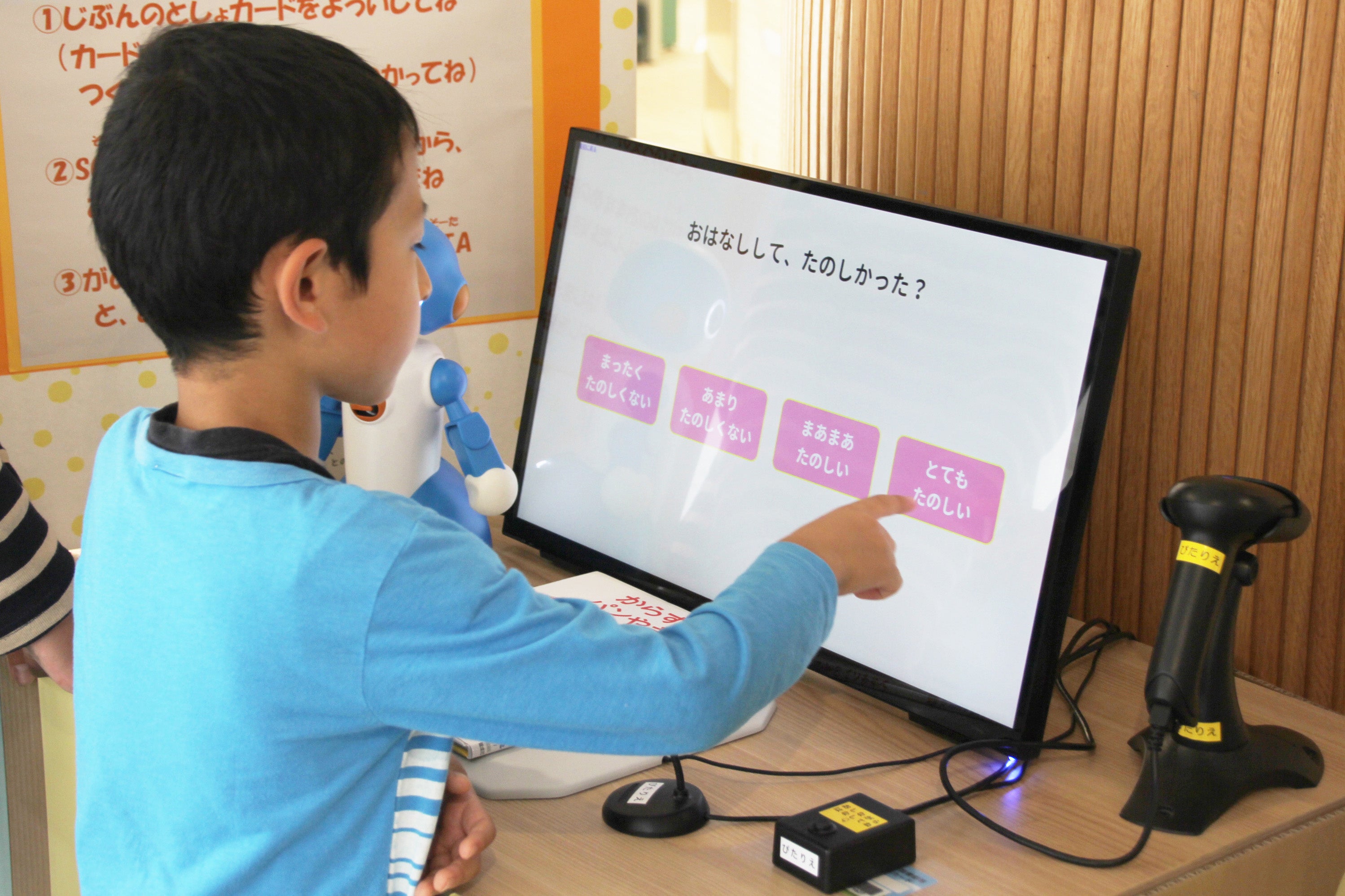 小学生が対象で、本に取り付けられているICタグを読み込むと、ロボットのSOTA(ソータ)が絵本を読んだ感想を子どもに質問します。回答するとSOTAがさらに関連した質問をすることで会話が続いていきます。
