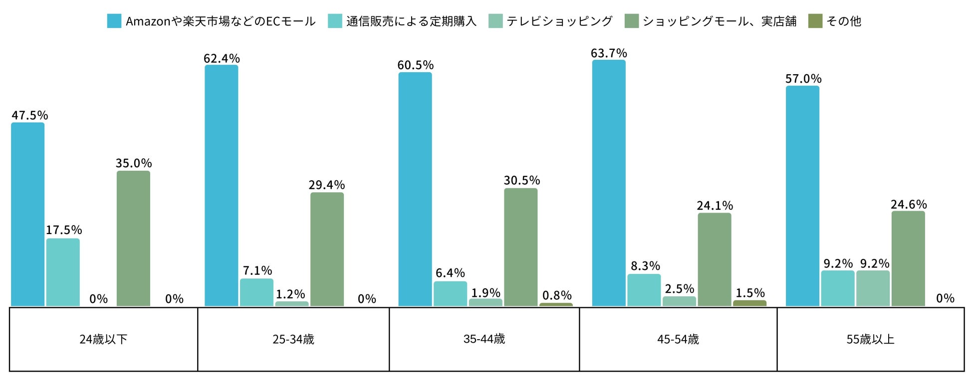 また、テレビショッピング利用者のライブコマース利用が1.7%から4.3%と相対的にアップしています。これは利用者の年齢層が上がった(特に55歳以上の方が倍以上に増えたことに起因)ことによるものであることが年齢別比較することで明らかとなりました。このことからライブコマースはテレビショッピング利用者とも親和性が高いと考えられる結果となりました。