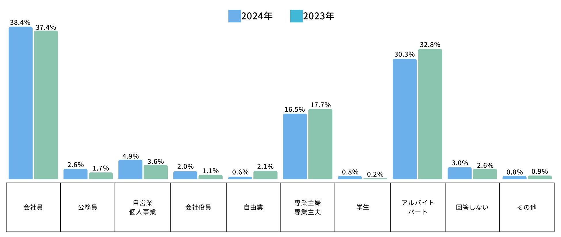 職業に関しては、昨年と比較した場合に大きく変化した層はありませんでしたが、会社員、会社役員、公務員、自営業・個人事業の層がそれぞれ昨年よりポイントアップ。