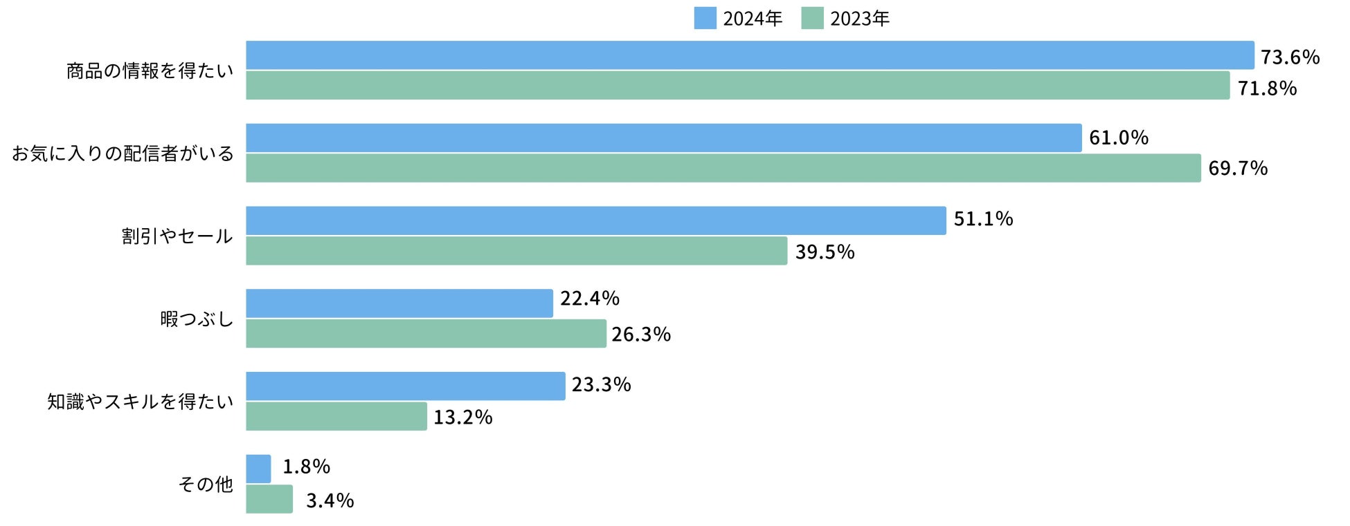 ライブコマースの視聴理由では、「割引やセール」が39.5%から51.1%に、「知識やスキルを得たい」が13.2%から23.3%と大幅増加。