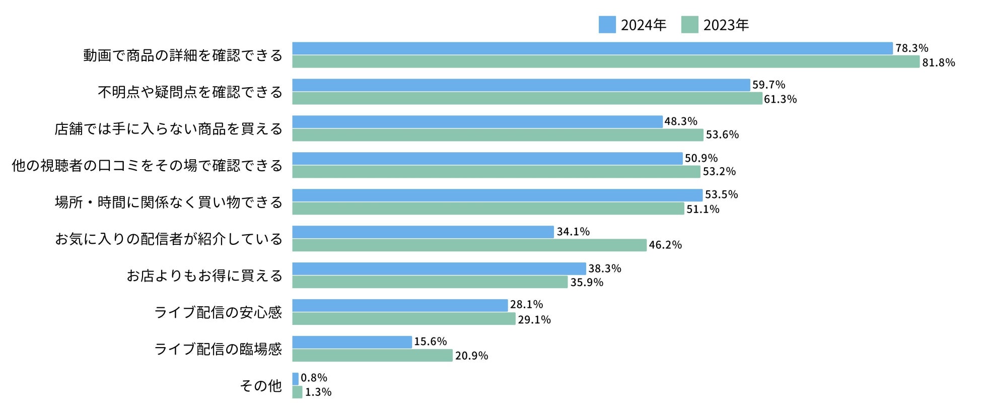 商品を購入する際の重要な要素としては、「商品の詳細を確認できる」や「不明点・疑問点を確認できる」は変わらず求められており、「場所・時間に関係なく買い物ができる」・「お店よりもお得に買える」はそれぞれポイントをアップしています。