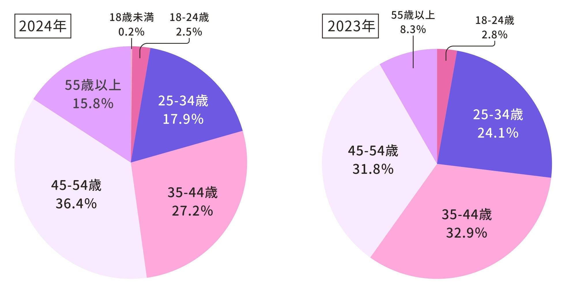 1)昨年と比較した際に、45~54歳、55歳以上が大幅に増加。特に55歳以上は昨年比で約2倍に拡大。
