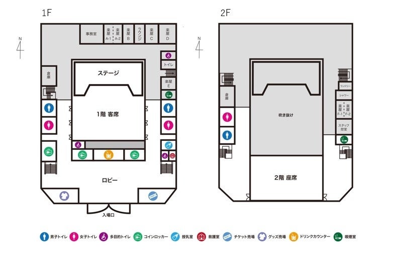 楽屋 :1F…A(2分割可)、B、C、D、E 5室及びラウンジ1室/2F…F(2分割可)