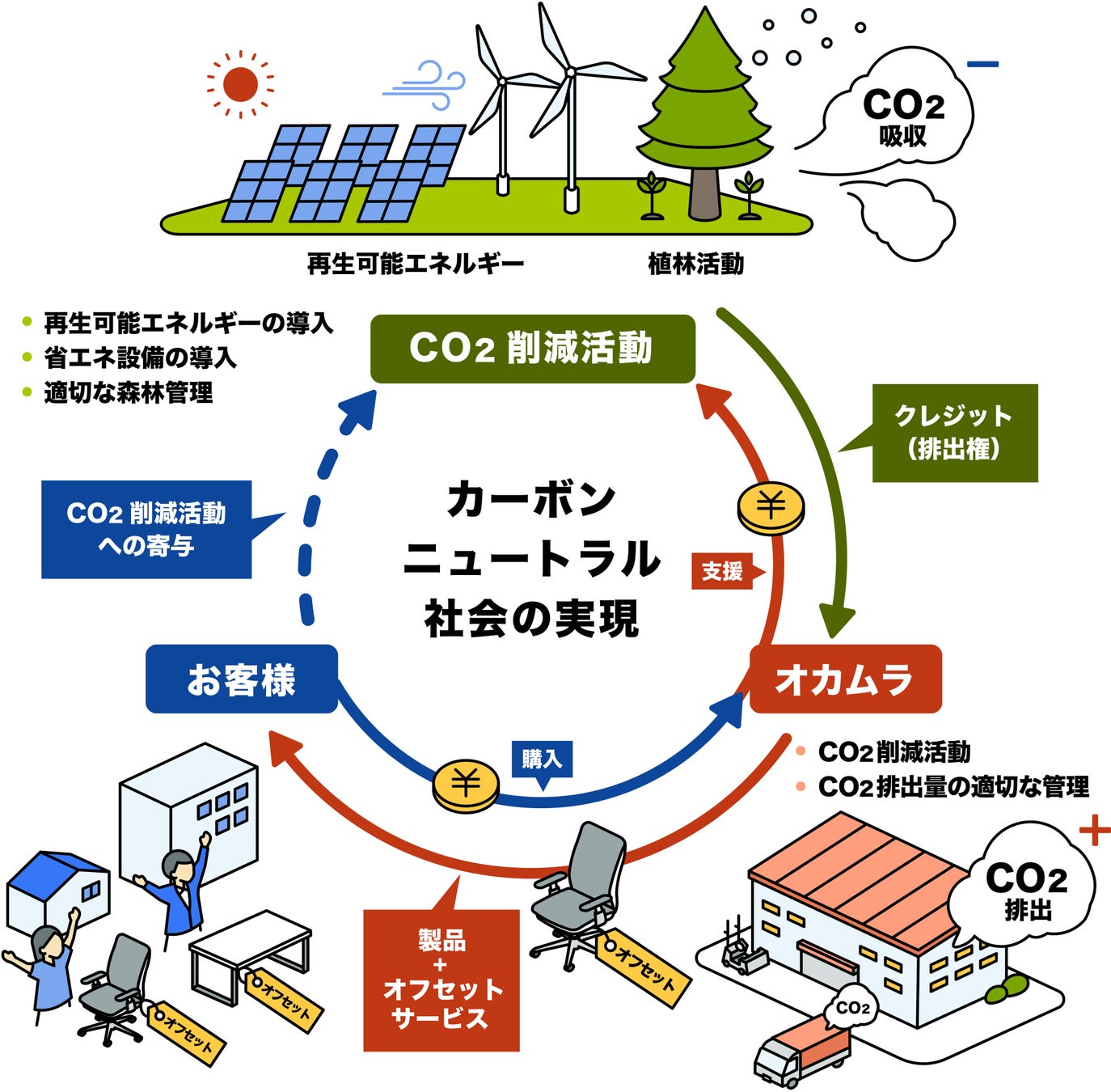 オカムラは、オフィス製品の製造、輸送、廃棄といった製品ライフサイクルを通じて、CO2の排出量を正しく計算し、カーボンオフセットを行うサービスをお客さまに提供する「カーボンオフセットプログラム」を2022年1月より提供しています。