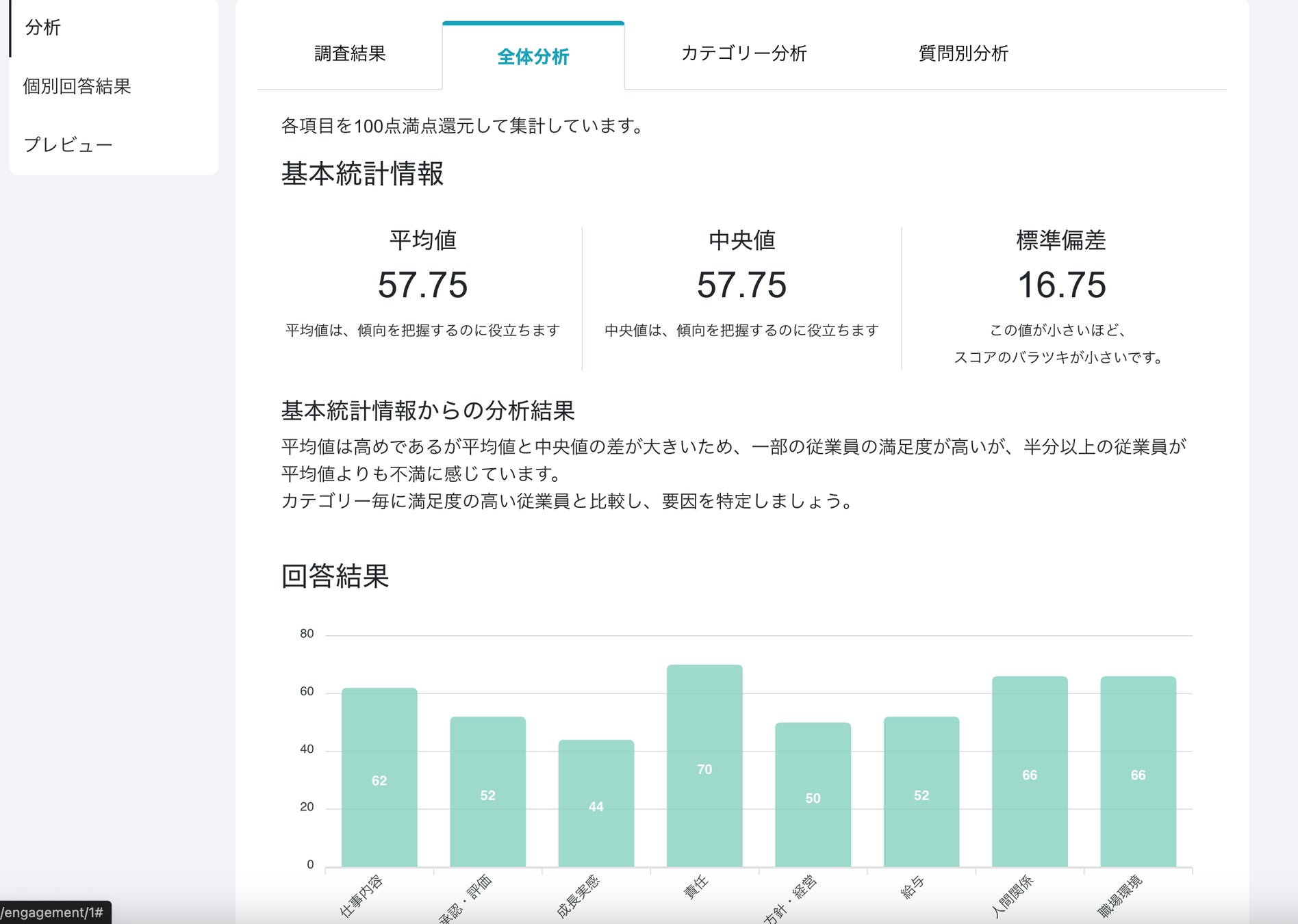人的資本では、各指標の選定に加え指標に対しての目標値が曖昧なケースが多く企業によって変化します。estomaでは、各指標に対して平均値と比べた評価をします。評価結果から評価が低いものに関してはAIによる改善提案サービスを準備しております。