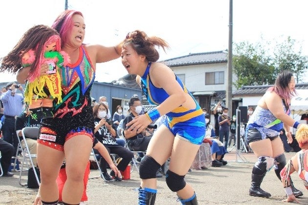 奉納女子プロレスの試合前には、オープニングアクトが実施されました。当日出席予定だったアイドルが欠席となったため、急遽「ナムー」というユニットを結成し、住職自らが3曲を披露。観客の手拍子と共に、会場は一体感に包まれました。