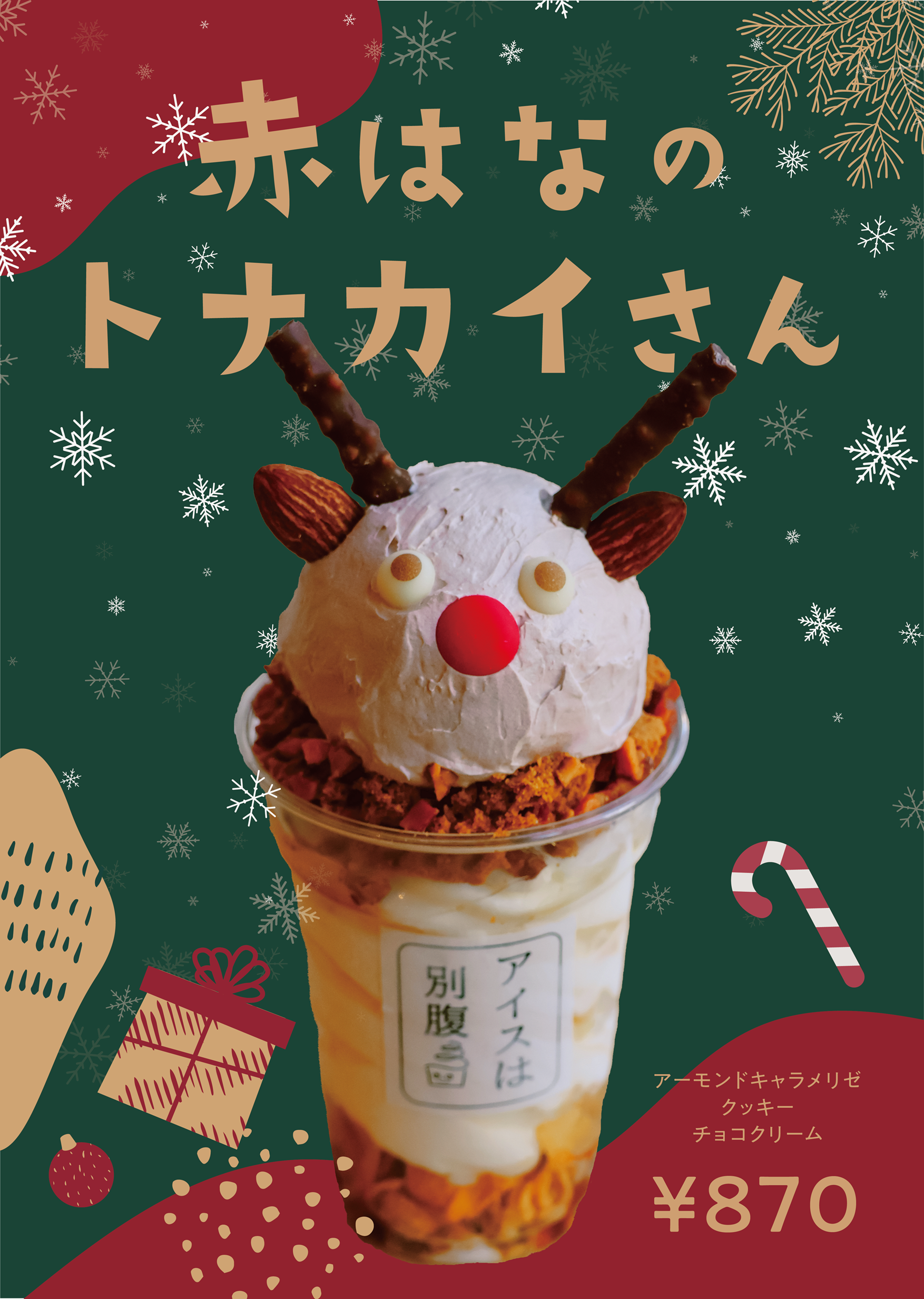 アイスは別腹三田店では、現在、上記のコンセプトのもと、冬でも楽しめるアイスクリームを展開しています。そして、12月のクリスマスシーズンに向けては、食べていただく人が、クリスマスを見た目や味わいで楽しんでいただける商品の開発を行いました。