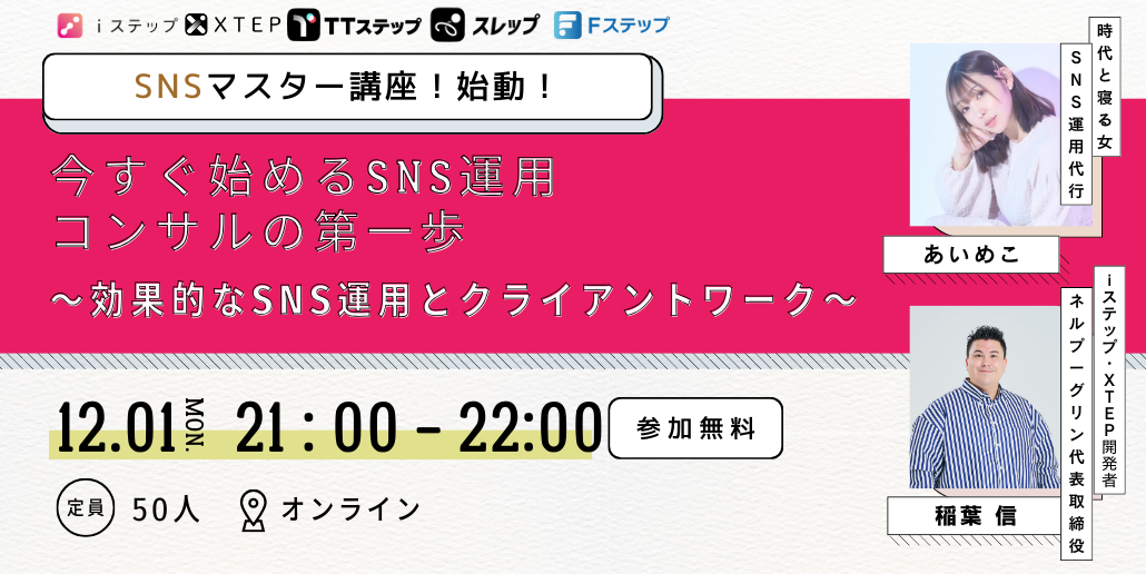 Instagramの自動化×LINEリスト獲得/X(旧Twitter)/Threads運用の最新戦略を学べる「SNSセミナー月間」を12月に開催。全7回・無料で現役SNS豪華講師が登壇します。