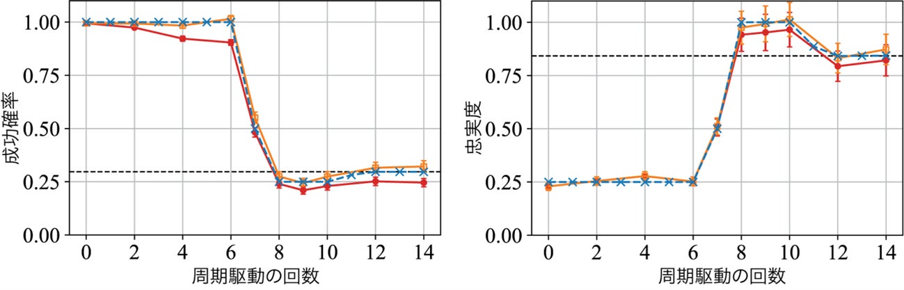 周期駆動系の量子回路に投入した情報を復元する成功確率(左)と復元された状態の忠実度(右)を、周期駆動の回数の関数としてプロットした図。周期駆動の回数は、量子アルゴリズムにおける計算時間の指標である量子回路の深さに比例する。赤い丸のデータはエラー緩和を行っていない結果、オレンジの四角のデータはエラー緩和を行った結果、青いバツ印は誤りのない理想的な場合の結果を示す。黒い破線はスクランブリング状態で期待されるそれぞれの値を示している。周期駆動の回数が大きくなるにつれ、得られた結果がスクランブリング状態で期待される値に近づくことが分かる。