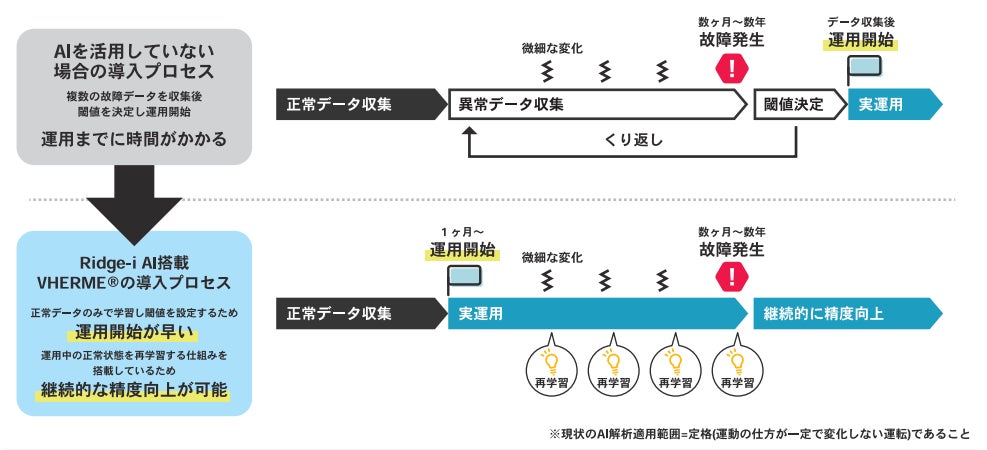今回共同開発した「VHERMEⓇ(ベルム)」では、正常データのみでモデルを構築、運用しながらAIが閾値の推奨値を提案します。従来と比較し、モデル構築に係る効率化と運用における課題の解消が期待できます。センサー設置後から1週間で現場運用が可能で、閾値の推奨値をもとに再学習を図り継続的に判定精度が向上します。