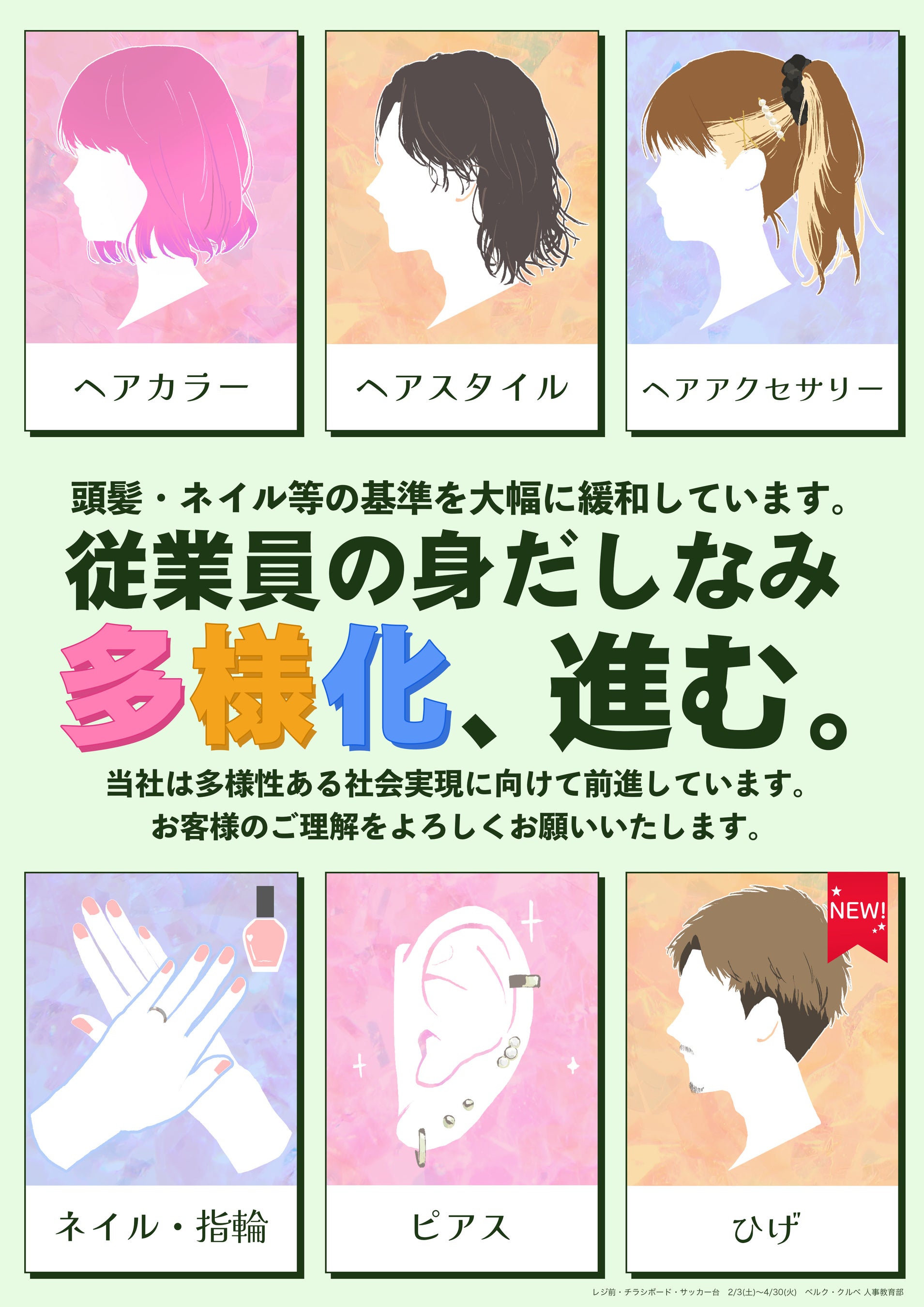 ベルクでは2023年9月より従業員の身だしなみ基準を見直し、髪色・髪型等の頭髪やピアス・指輪等の装飾品、ネイル等の制限を大幅に緩和しました。これにより、これまで以上にイキイキと働く従業員が増え、また、お客様からもお褒めの言葉を数多くいただくことで、より自信を持って活躍できる社内風土が醸成されてきております。