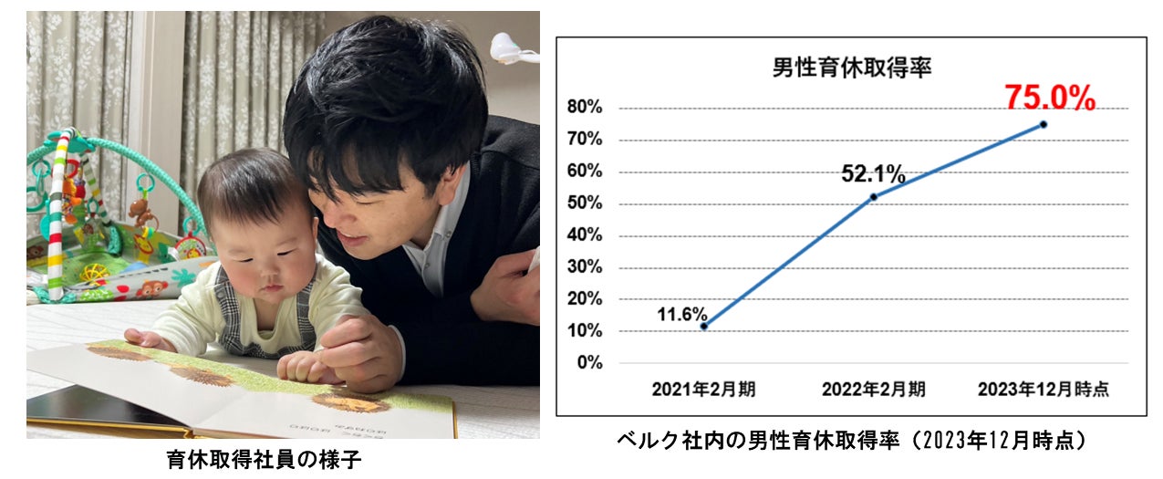 これまでベルクの育休取得率は、女性従業員が100%を維持する一方、男性従業員は10%程度と低い水準となっていました。その中で、2022年4月に育児・介護休業法が改正されたことを機に、ベルクでは男性従業員への育休取得の意向確認を強化しました。その結果、2023年2月期は52%となり、直近1年間(2023年12月時点)では、75%まで引き上がりました。