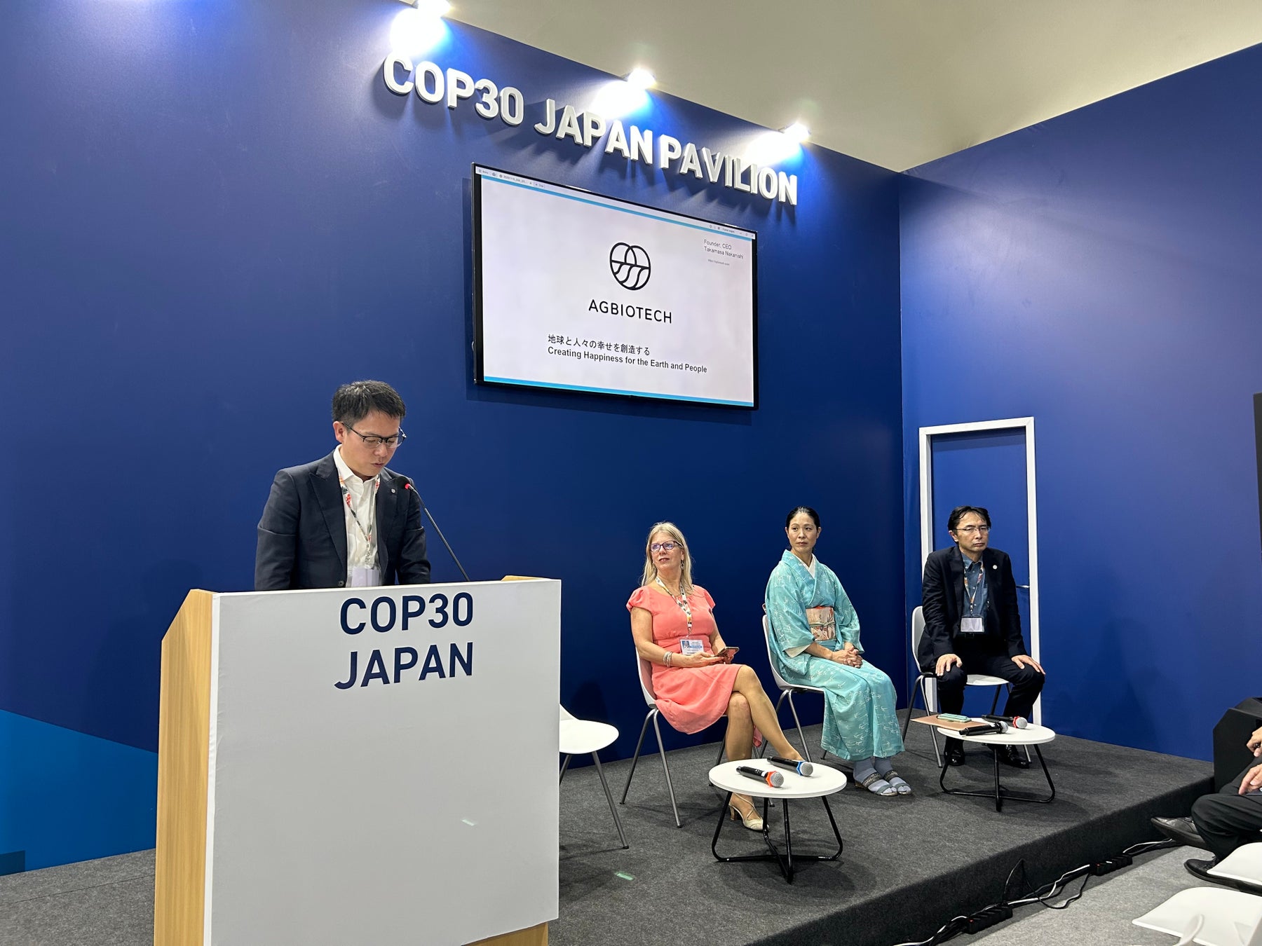 この度、2025年11月10日から21日にかけてブラジル連邦共和国・パラ州ベレンで開催された「国連気候変動枠組条約第30回締約国会議(COP30)」において、AGBIOTECH(アグバイオテック)株式会社(所在地:東京都港区、代表取締役:中西隆允、以下「当社」)は現地に設けられたJAPAN PAVILIONセミナーへ登壇いたしました。