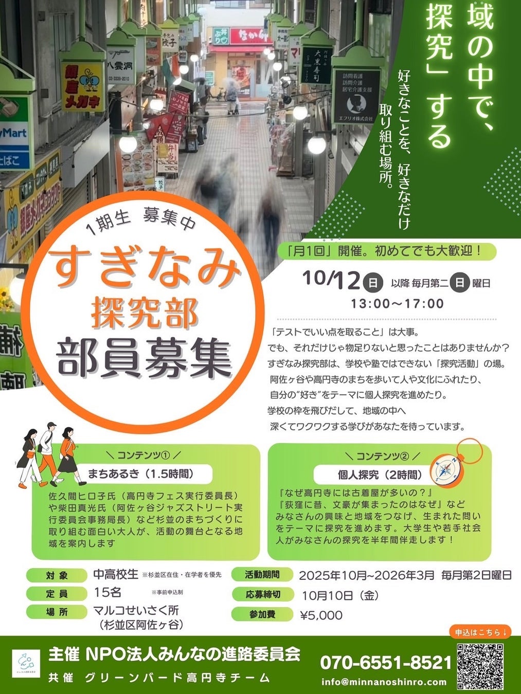 今年、たかまつ探究部(香川県高松市)を4月にスタートさせたNPO法人みんなの進路委員会が、10月よりすぎなみ探究部(東京都杉並区)を開始させます。