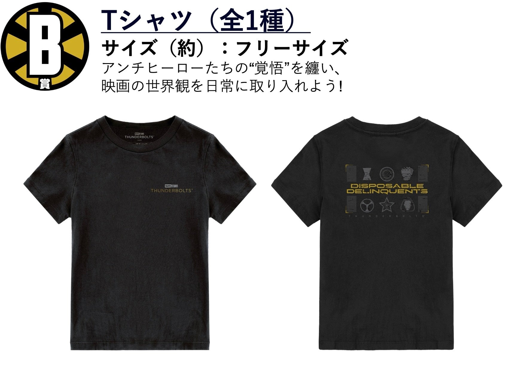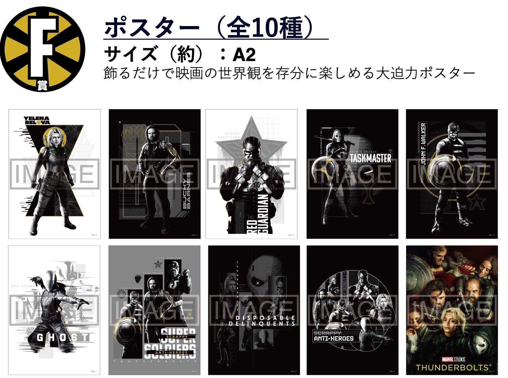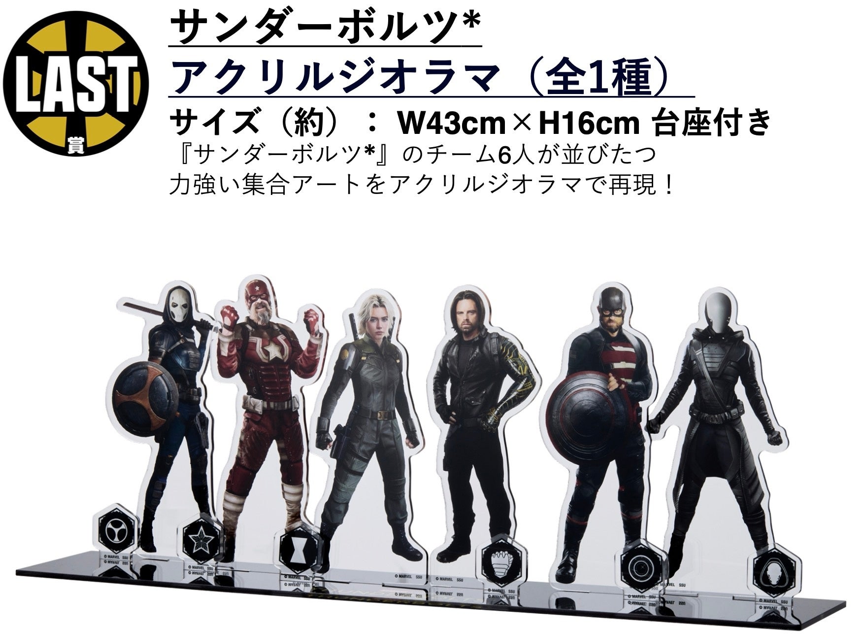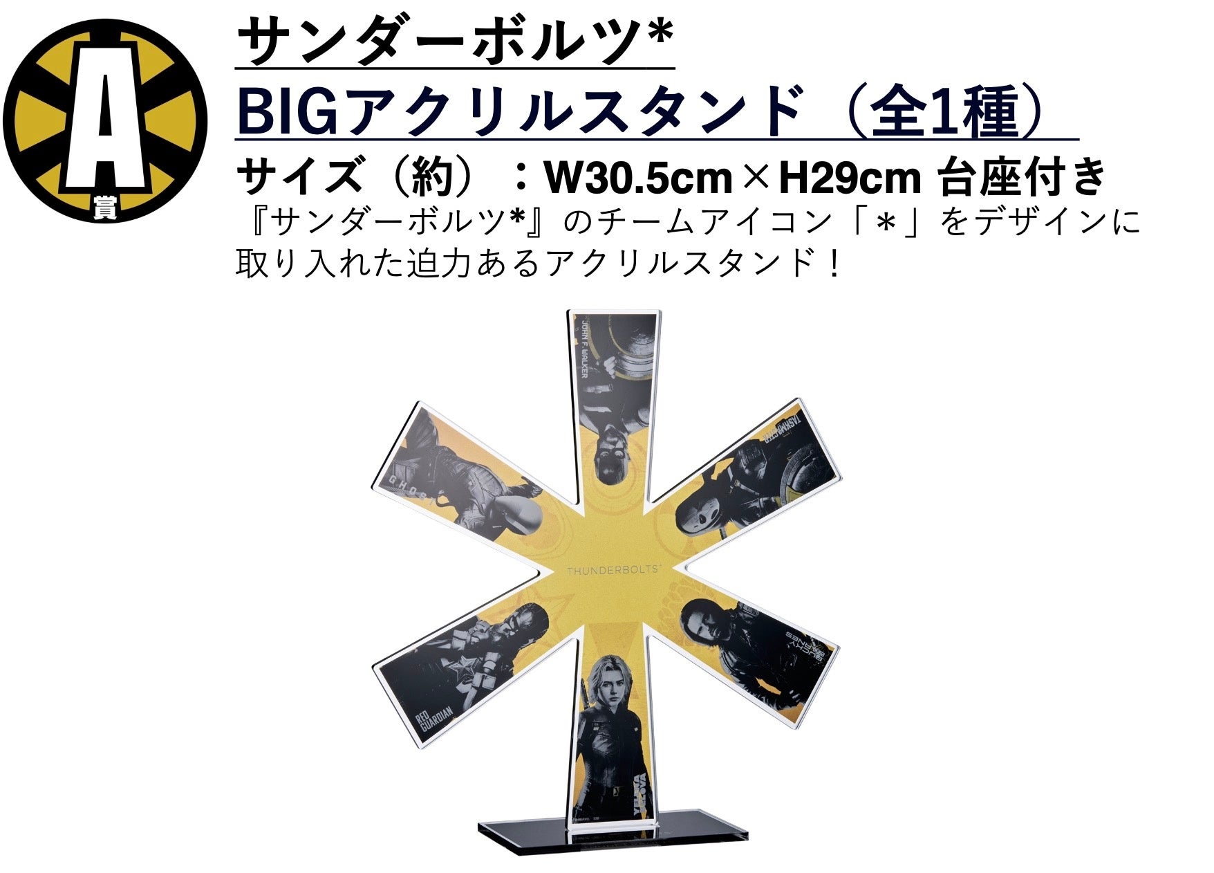 今回の目玉は高さ約30cmのA賞「サンダーボルツ* BIGアクリルスタンド」!チームの象徴的なアイコン「*」をデザインに取り⼊れ、ゴールドに煌めく塗装が施された贅沢な仕上がりになっています。また、LAST賞は『サンダーボルツ* 』の6⼈が並びたつ「サンダーボルツ*. アクリルジオラマ」です。迫力のあるチームの集合をお部屋でお楽しみいただけます。その他にも映画の世界観が楽しめる景品を多数ご用意いたしました!力強くクールな『サンダーボルツ* 』を、映画館だけでなく店頭でもお楽しみください!