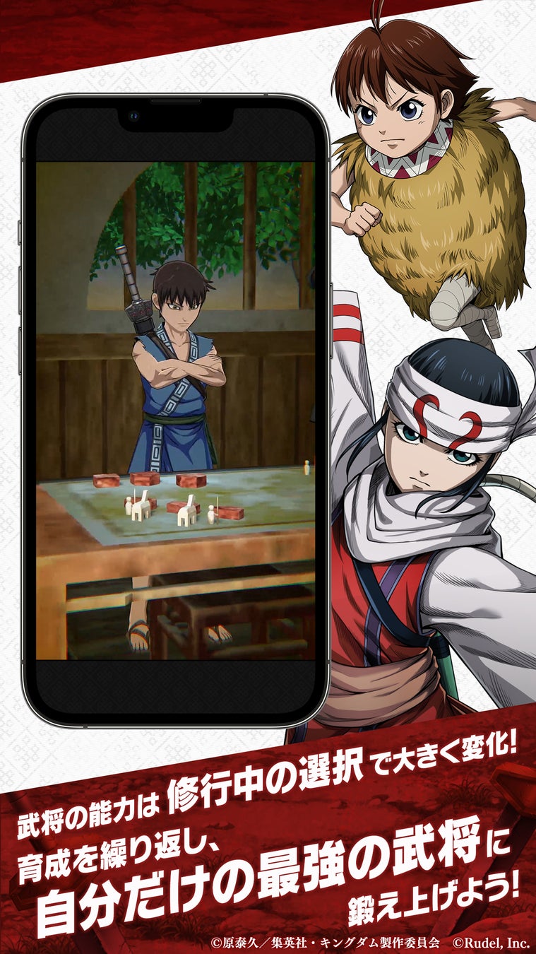 本ゲームはキングダムのオリジナルソーシャルゲーム6本目の作品となる、育成シミュレーションゲームです。主人公は練兵家となり『キングダム』に登場する武将たちを獲得、育成し、育成した武将たちを率いて最強の軍隊を編成、並み居る強敵を討ち倒し中華の『頂天』を目指します。