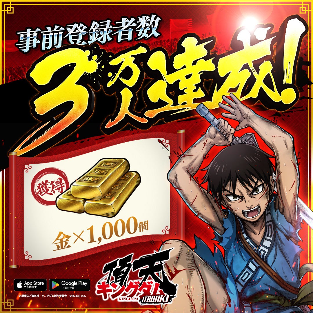『キングダム 頂天』の事前登録者が3万人を突破いたしましたので、リリース後に金1,000個を皆様にプレゼントいたします。誠にありがとうございます!