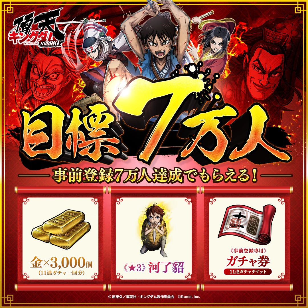 株式会社ルーデル(本社:東京都新宿区、代表取締役:和泉 晴)は、アニメ『キングダム』を題材とするスマホゲーム『キングダム 頂天』の事前登録者数が3万人を突破したことをお知らせいたします。