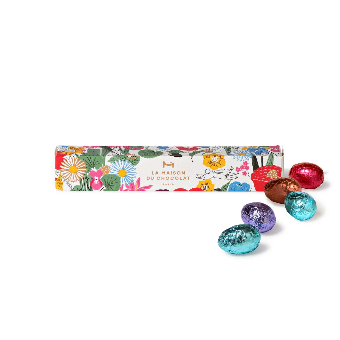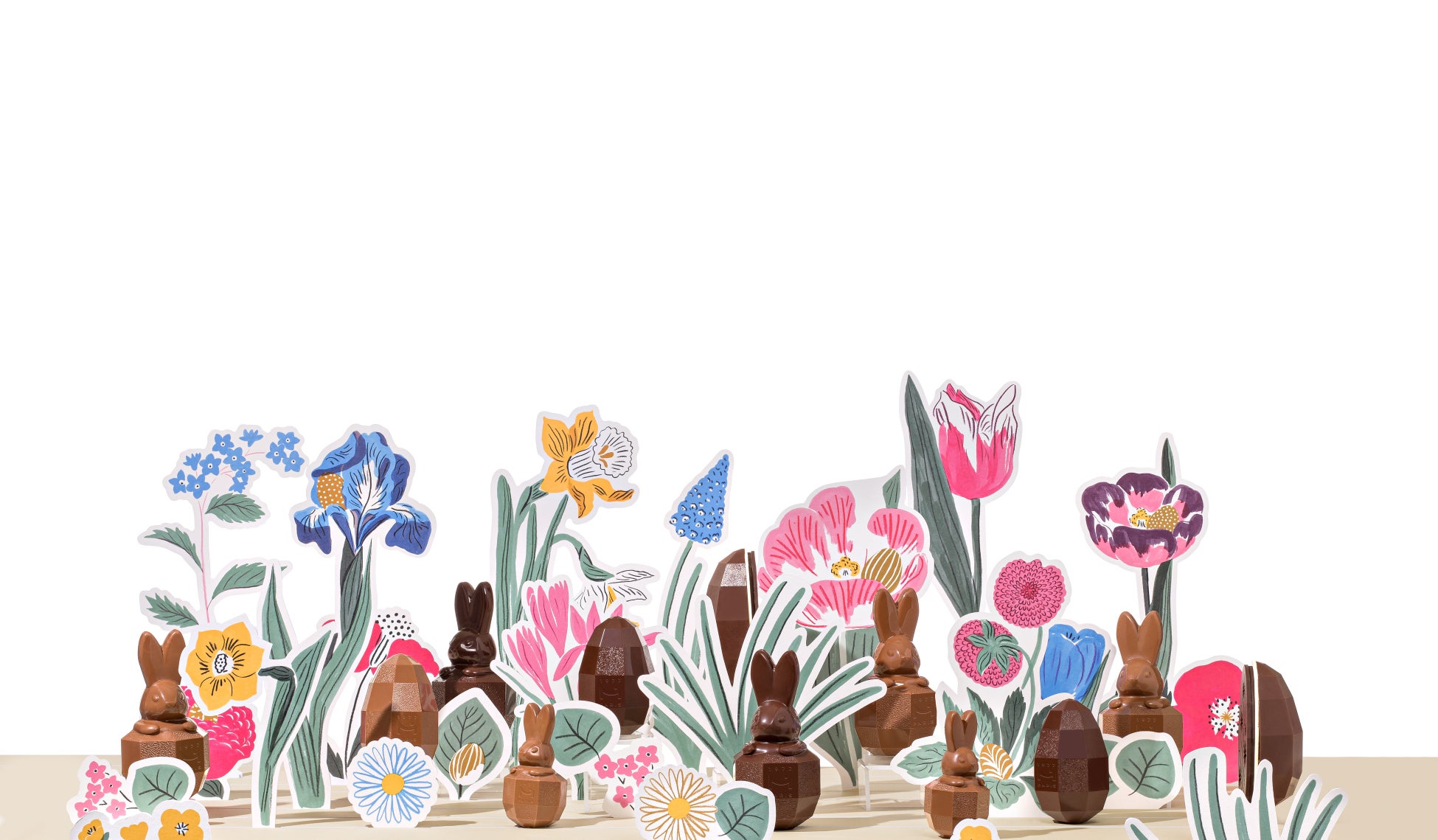 繊細な花びらや青々とした緑の葉に囲まれた豊かな自然の中に様々なタマゴが隠され、色とりどりの春らしい花々が咲き乱れる野原の一角で始まるかくれんぼ。チョコレートが自然の美しさと調和するこの世界では、すべてのタマゴは皆をワクワクさせる宝物です。