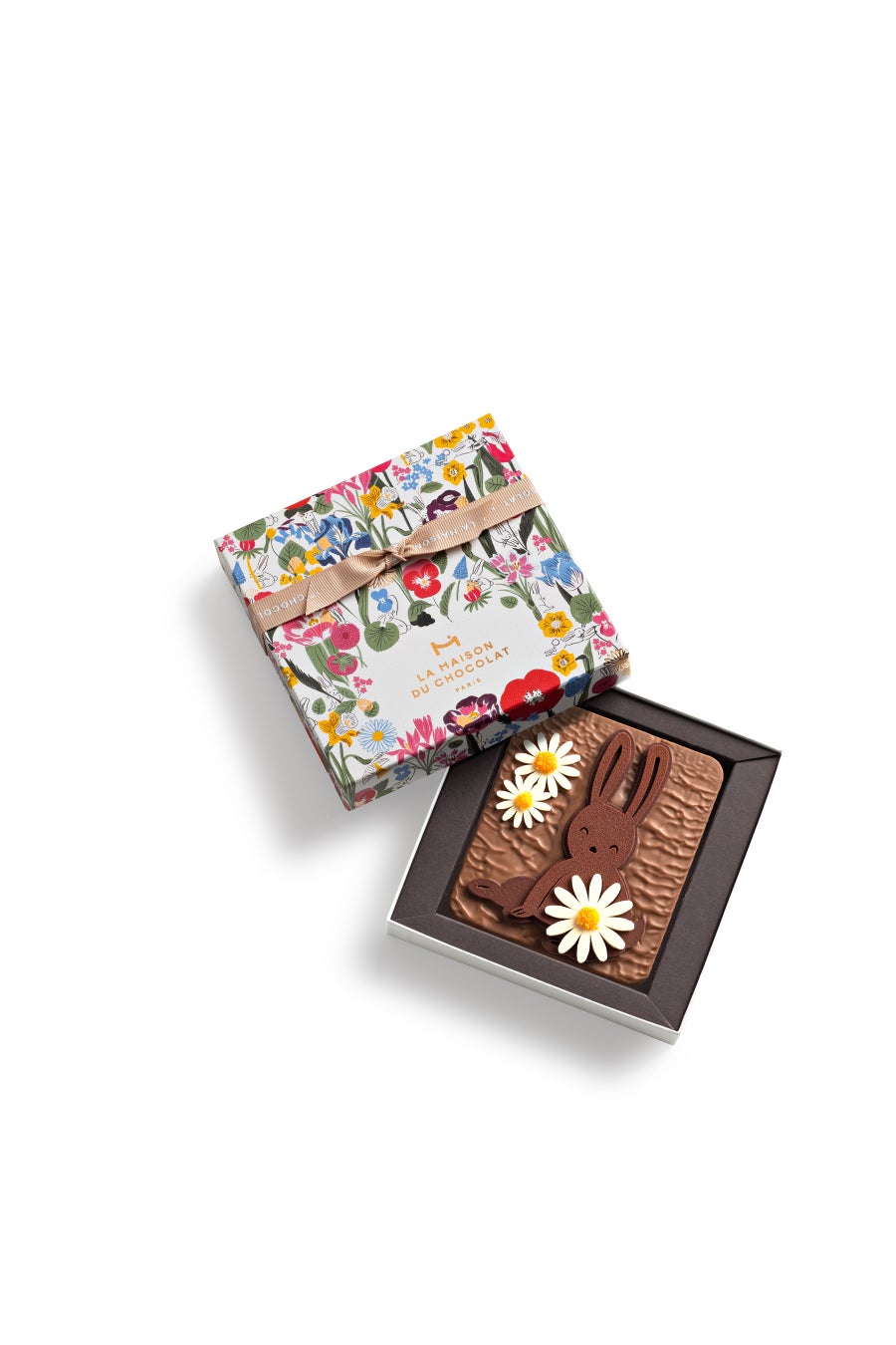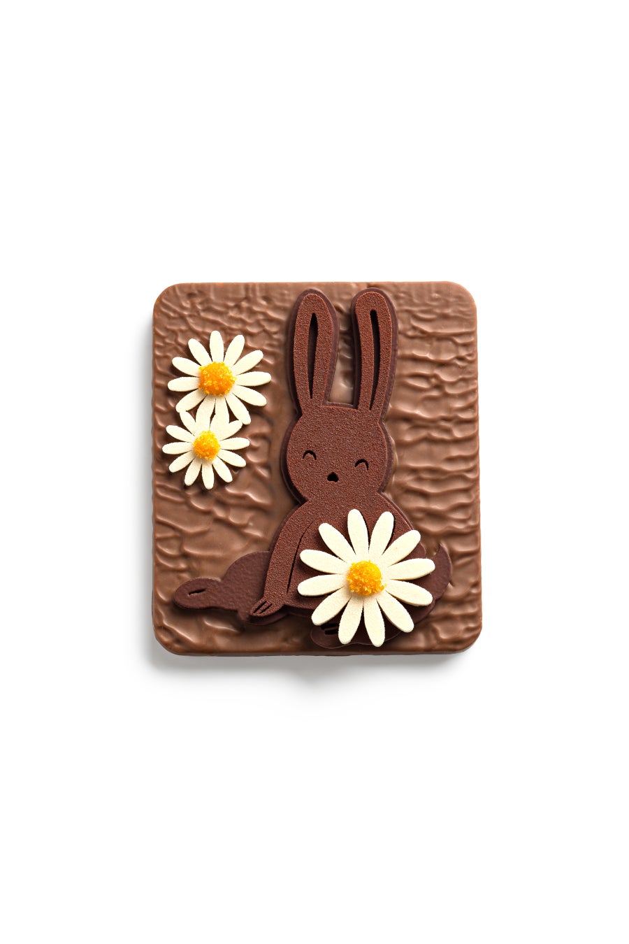 内 容:春の兆しを感じるデイジーの花に囲まれた茂みの中からウサギが顔を出して微笑んでいる可愛らしいデコレーションのミルクチョコレート。