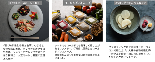 ミシュラン店出身の料理人による準備食・復食に、ファスティング食は果物野菜を贅沢に使ったコールドプレスドリンクで美味しさを追求。