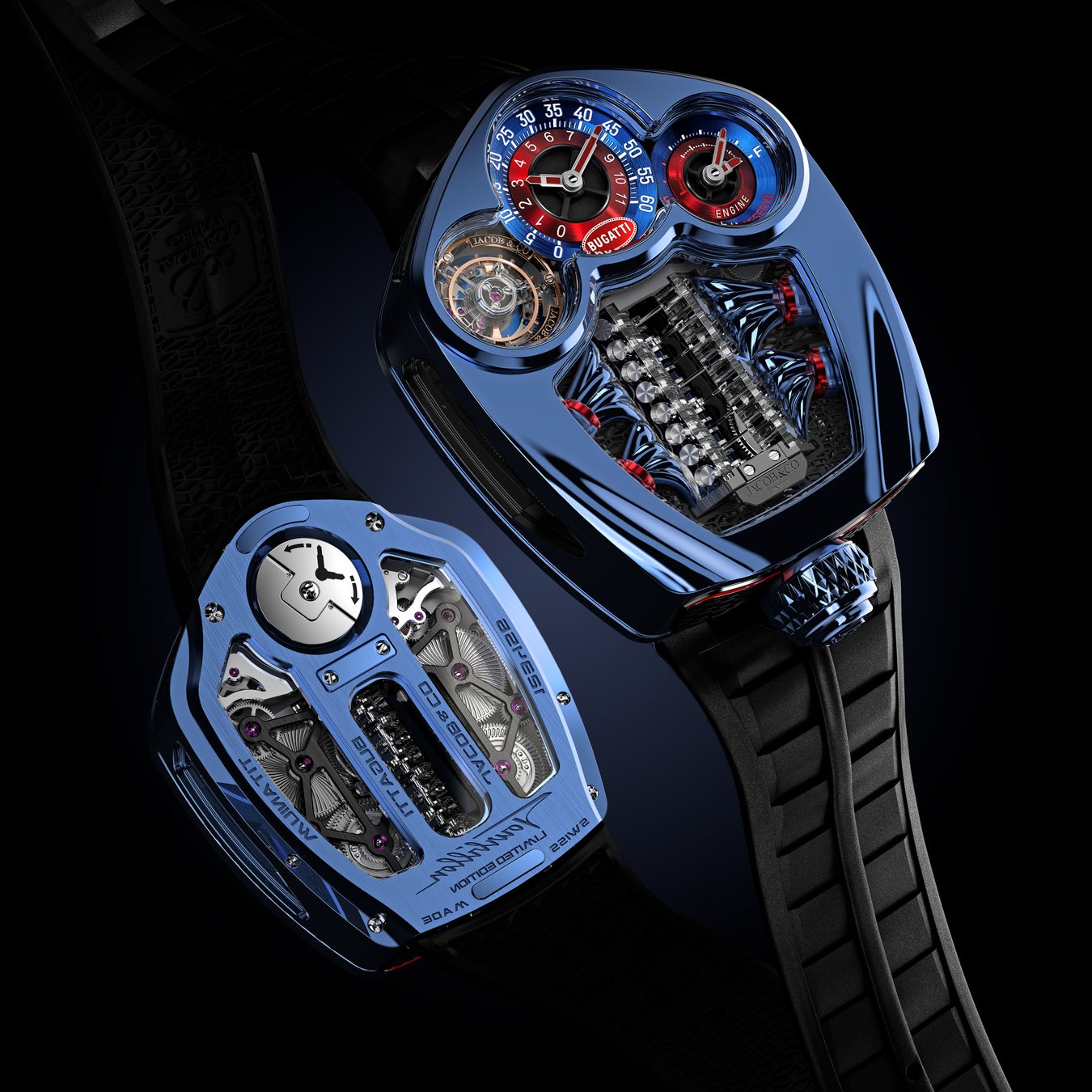 ジェイコブ&コーの協業の中でも、最も衝撃的なパートナーシップの一つが、フランスのハイパーカーブランド「ブガッティ」との提携です。2019年に長期契約を結び、最初に誕生したのが「ブガッティ シロン トゥールビヨン」。ブガッティ・シロンのW16エンジンをミニチュア化し、機械式で駆動する可動式ピストンを搭載しています。サファイアクリスタルのケース内では、16個のピストンが駆動し、クランクシャフトが実際に回転。その精密な動きは、時計というよりも“動く彫刻”と呼ぶにふさわしいものです。さらに、パワーリザーブインジケーターは実車の燃料計を模しており、細部に至るまでブガッティのDNAが息づいています。クルマと時計、2つのメカニズムが価値観を共有して生まれた、唯一無二の傑作です。