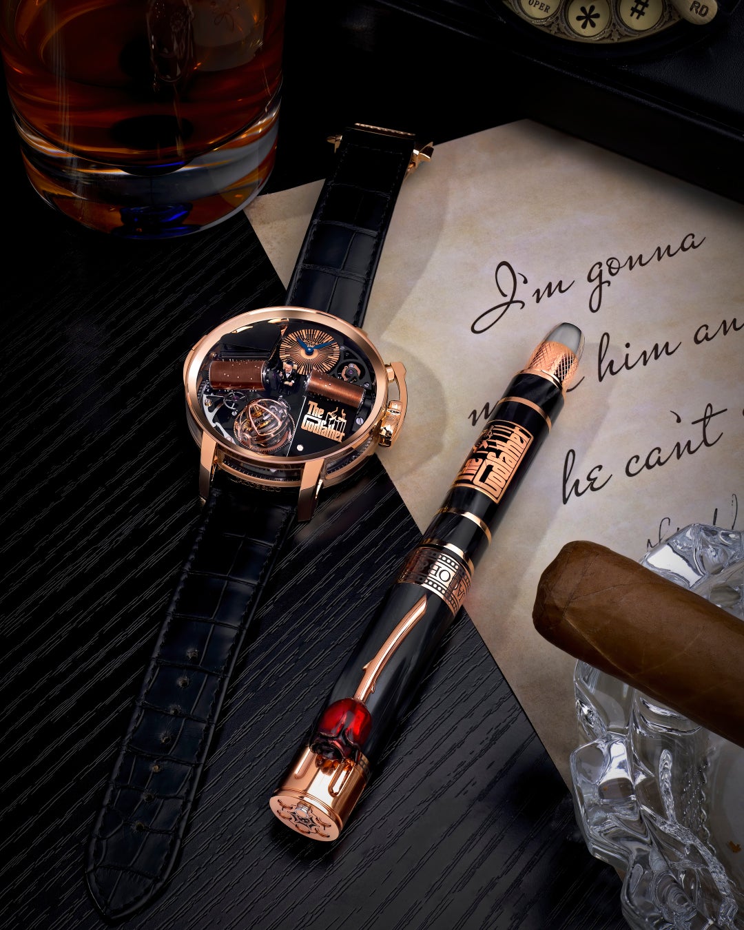 映画界の名門、パラマウント・ピクチャーズが時計ブランドと初めて手を組んだパートナーシップによって誕生したのが、映画『ゴッドファーザー』をモチーフにした「オペラ ゴッドファーザー」シリーズです。文字盤中央には、ドン・コルレオーネのミニチュアが立ち、オルゴール機構が組み込まれた独自ムーブメントが名曲「Speak Softly Love」を奏でます。さらにオルゴール演奏中は、トゥールビヨンや文字盤、ピアノなどがドン・コルレオーネを中心に回転するという驚愕の動きを実現。まさに演出性と機能性が両立した“劇場型タイムピース”といえます。