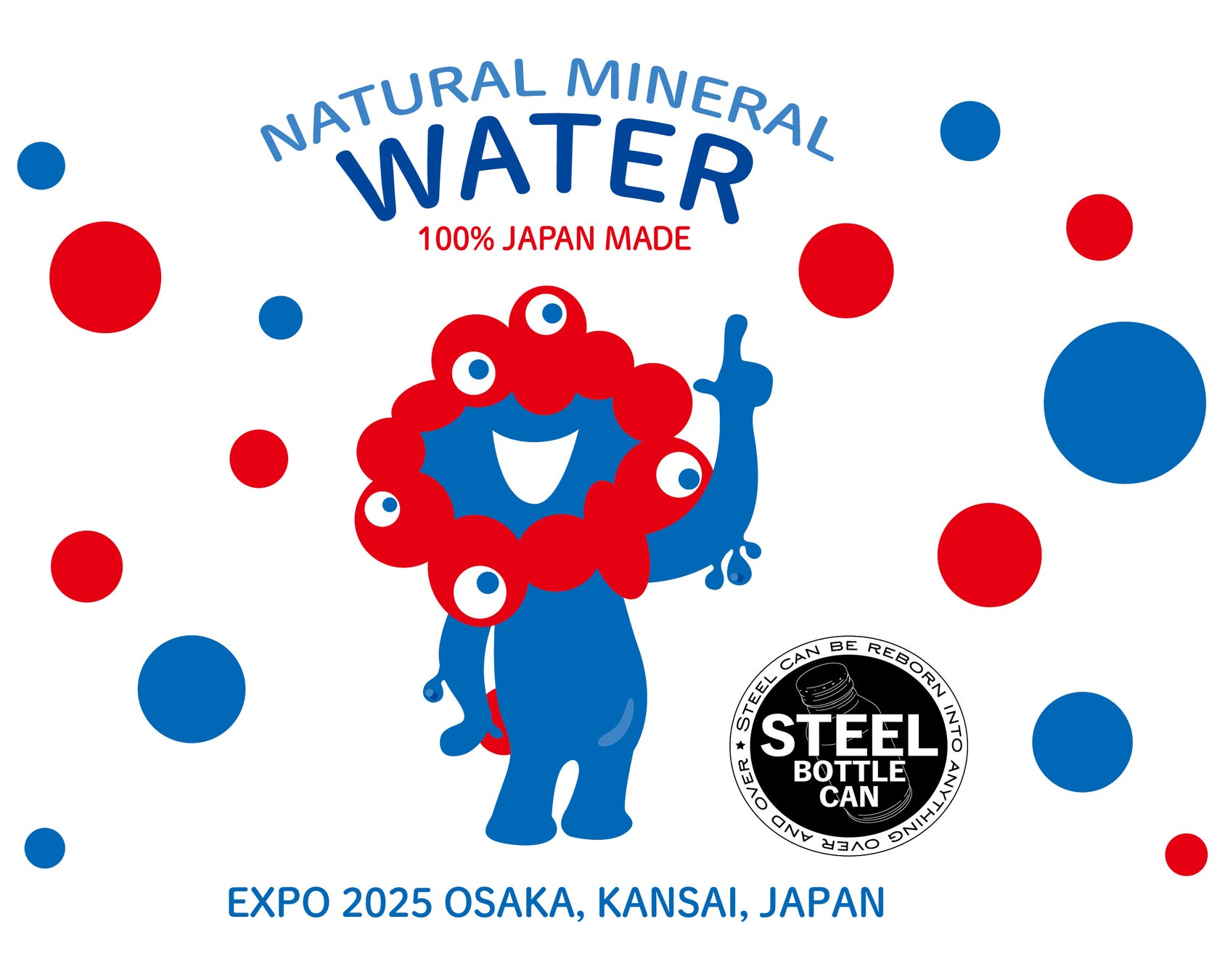 大阪・関西万博のイメージカラーを基調としたポップな背景に公式キャラクターである「ミャクミャク」を中央にデザインしました。ミャクミャクのポーズはアソート仕様で2種類の中からランダムで配布されます。また、背面にはスチールボトル缶の素材として使用されている「スチール(鉄)」のリサイクル性や環境にやさしい素材を伝えるメッセージを記載しています。