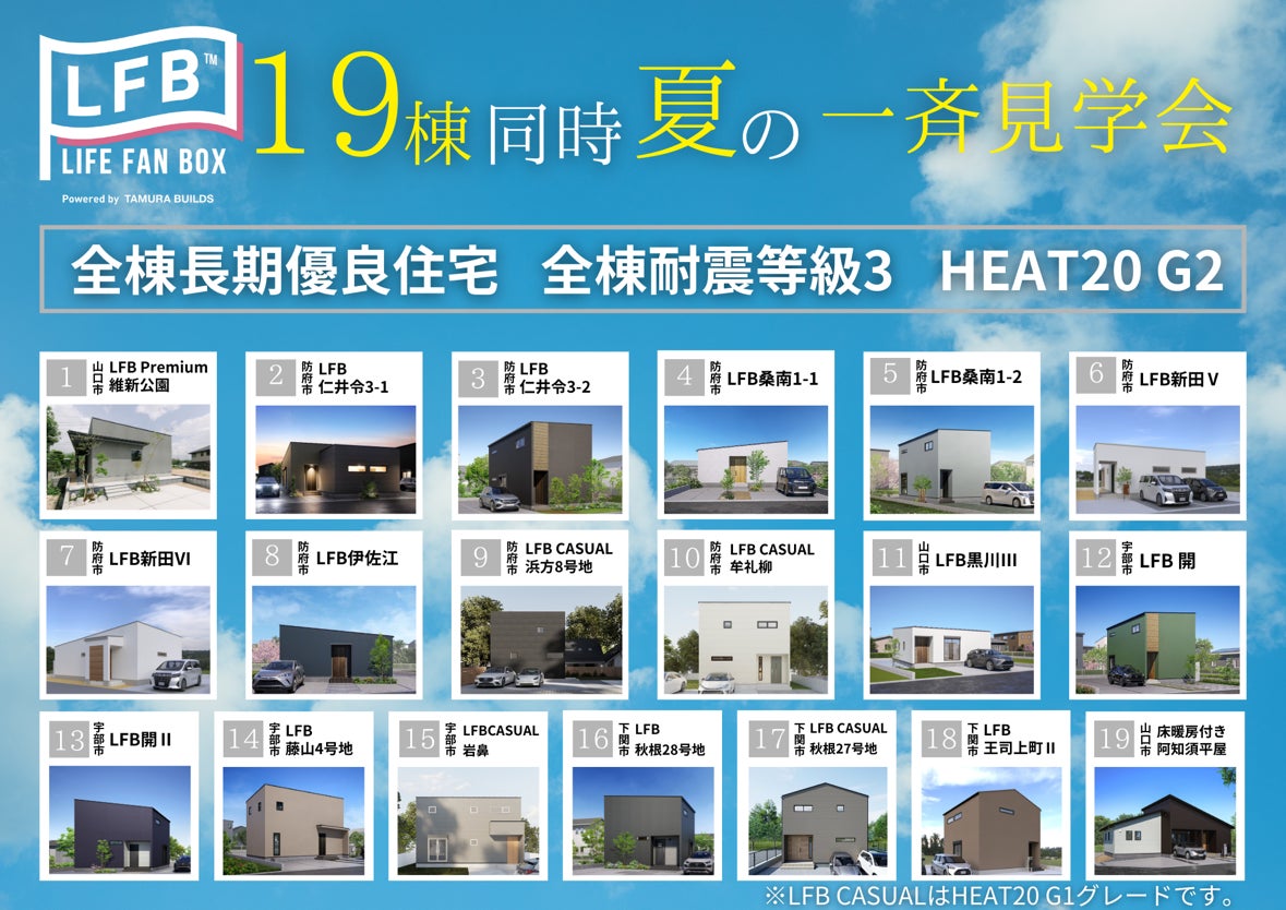 株式会社田村ビルズ(本社:山口県山口市黒川 代表:田村 伊幸)が手掛ける住宅ブランド「LIFE FAN BOX=LFB」。そのLFB新築建売住宅を19棟同時に見ることができる夏のイベントを開催します。「気軽にモデルハウスをいくつか見学したい」「家づくりなにから始めたらいいの?」とお悩みの皆さん!今回のイベントでは、建売住宅を探している方だけでなく、注文住宅・土地探し・間取り相談・住宅ローンについてなど、家づくりに関する相談にも幅広くご対応させていただきます。また、山口県内一斉見学会となっておりますので、理想の間取りや好立地の物件などに出会えるチャンスです。ぜひお気軽にお越しください。