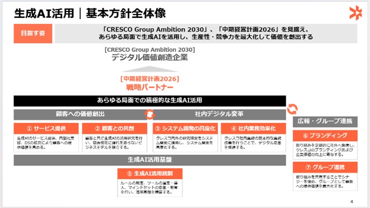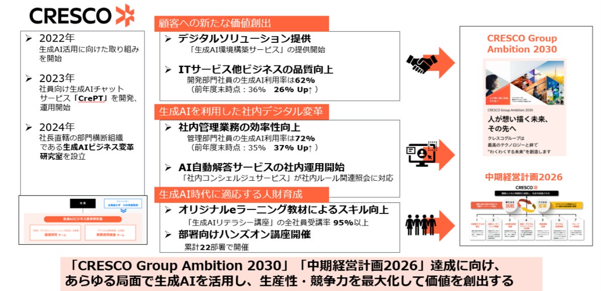 「CRESCO Group Ambition 2030」と「中期経営計画2026」を念頭に置き、あらゆる局面で生成AIを活用することで、生産性と競争力を最大化し、世の中に新たな価値を創造していきます。