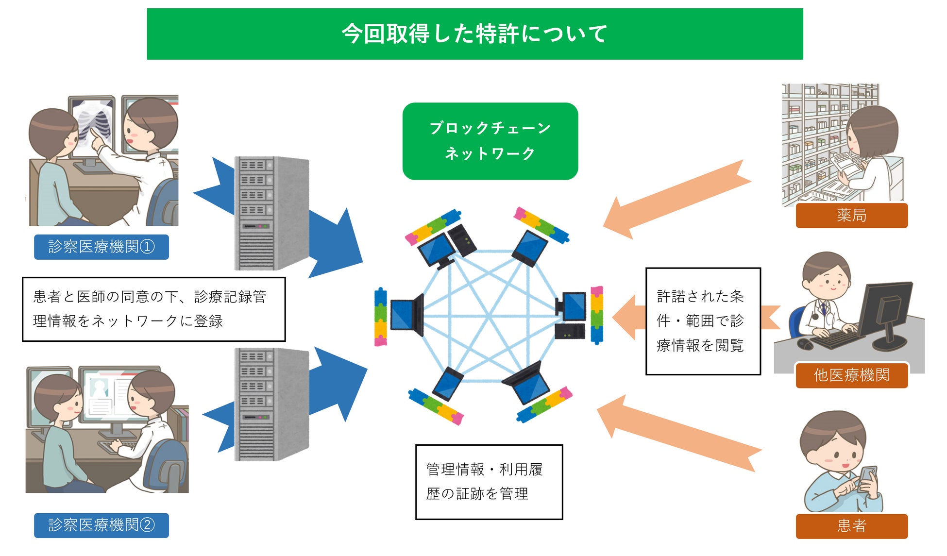 この特許技術を活用することで、例えば特定の医療機関が持つ患者の診療情報を、セキュアに他の医療機関と共有することができ、患者や医師、医療機関の利便性向上と医療サービスの品質向上に寄与することが想定されます。