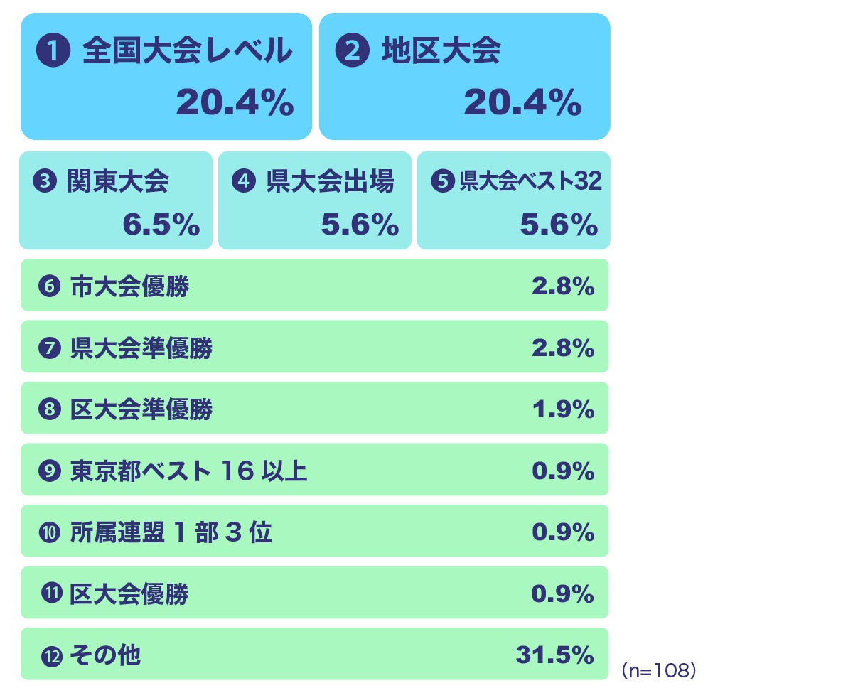 -全国大会レベルが20.4%、また地区大会も同じく20.4%と回答がありました。次いで、関東大会、県大会出場、県大会ベスト32という成績もありました。