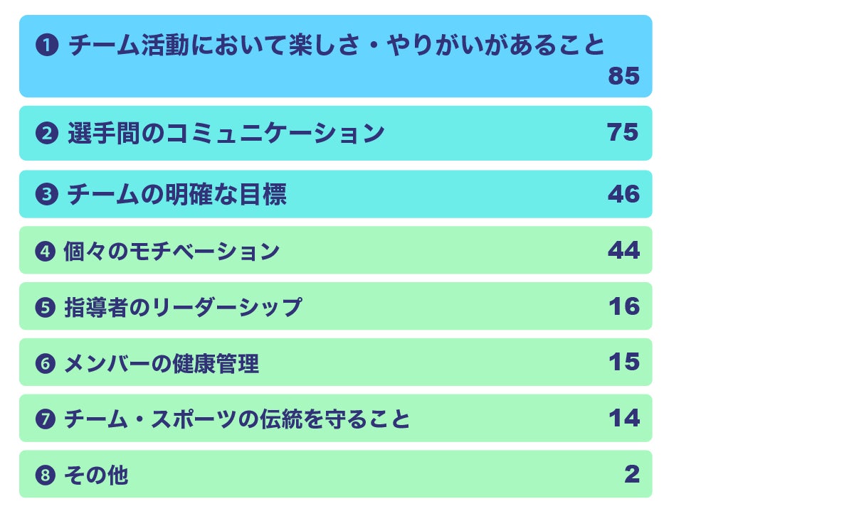 一番多かった回答は「チーム活動において楽しさ・やりがいがあること」で、次に「選手間のコミュニケーション」でした。また、「チームの明確な目標」「個々のモチベーション」の回答もあり、チームワークを上げるためにもコミュニケーションが欠かせないと言えます。