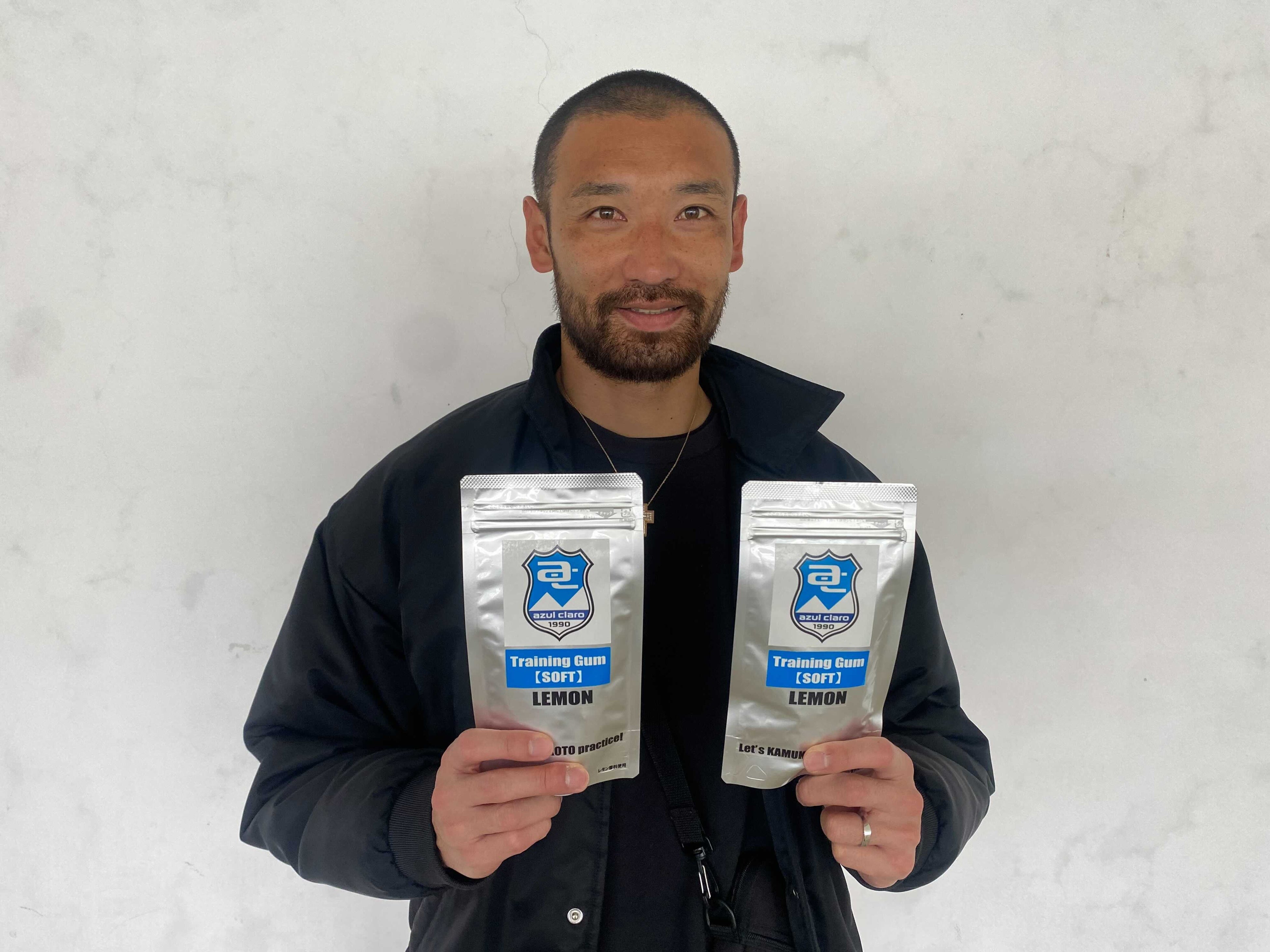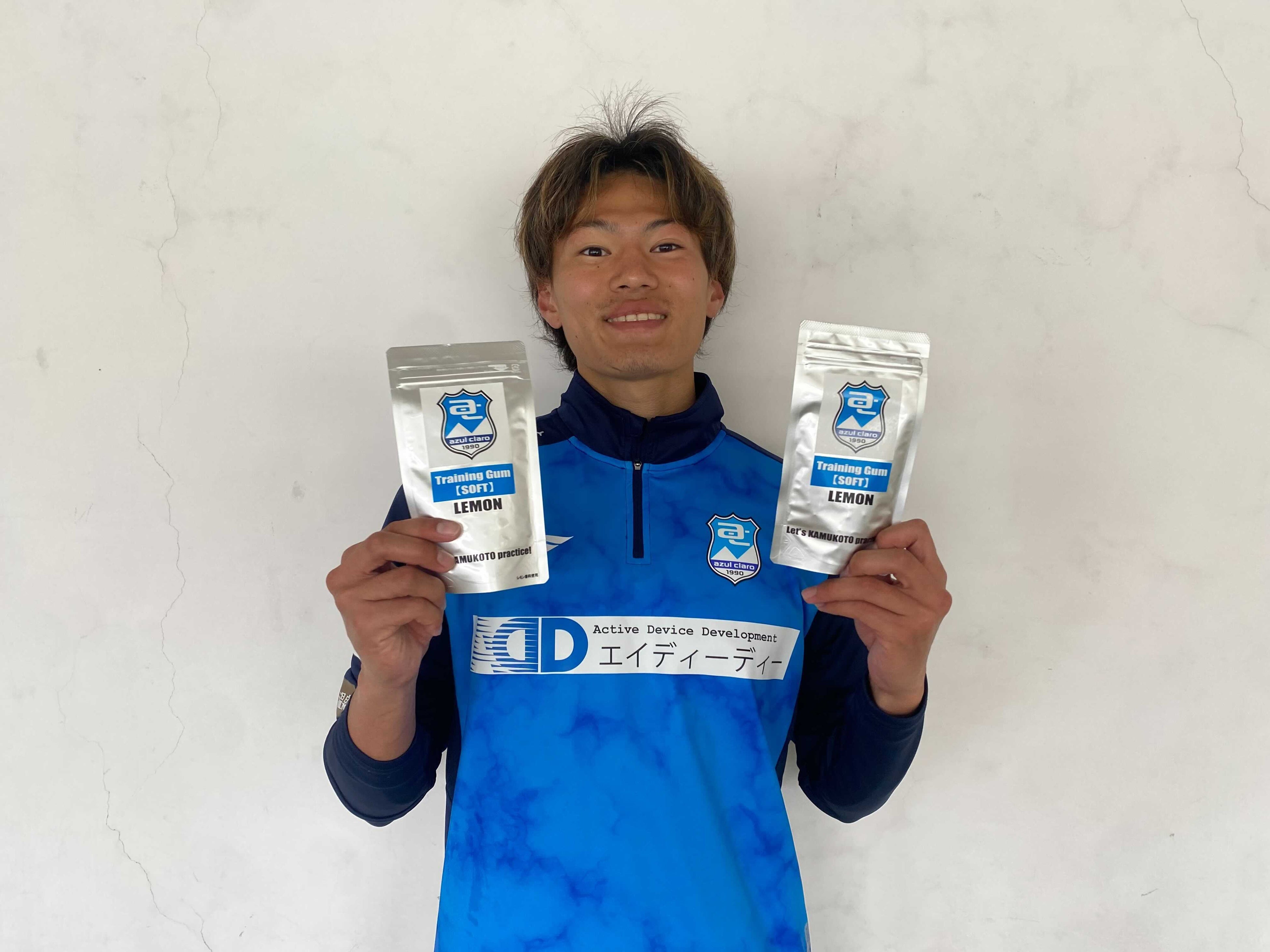 チーム専用トレーニングガムとは、一般的なガムに比べ、噛みはじめからの硬さの変化が少ない特別な設計となっています。噛んでいる間中、しっかりとした噛み応えが続くことで、噛むことのトレーニングに適しています。ソフト・ミドル・ハードの3段階の硬さのラインナップを準備しており、今回は<ソフト>の硬さのガムを提供しました。附木雄也選手は「普段、練習中、運転中にガムを噛んでいます。1日4時間以上、3粒のガムを噛んでおり、必要不可欠な存在です。トレーニングガムは硬さが持続するため水分を口にしても緩まないところが良いです。また、過去にマウスピースをつけてプレーをしていたこともありますが、ガムを噛んでいる方が集中できる感覚があります。チームのJ2昇格を目標として、トレーニングガムをキーアイテムに一緒に戦っていきたいです」と意気込みをいただきました。