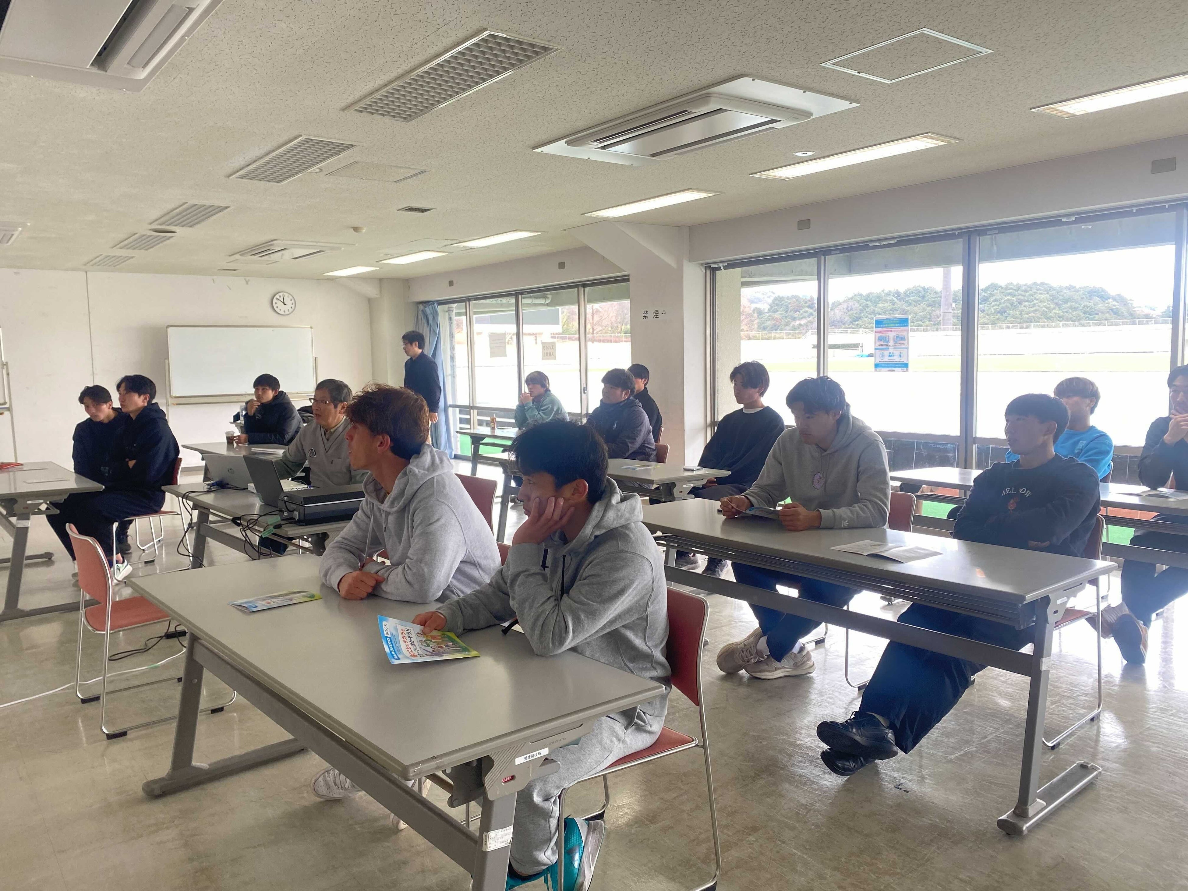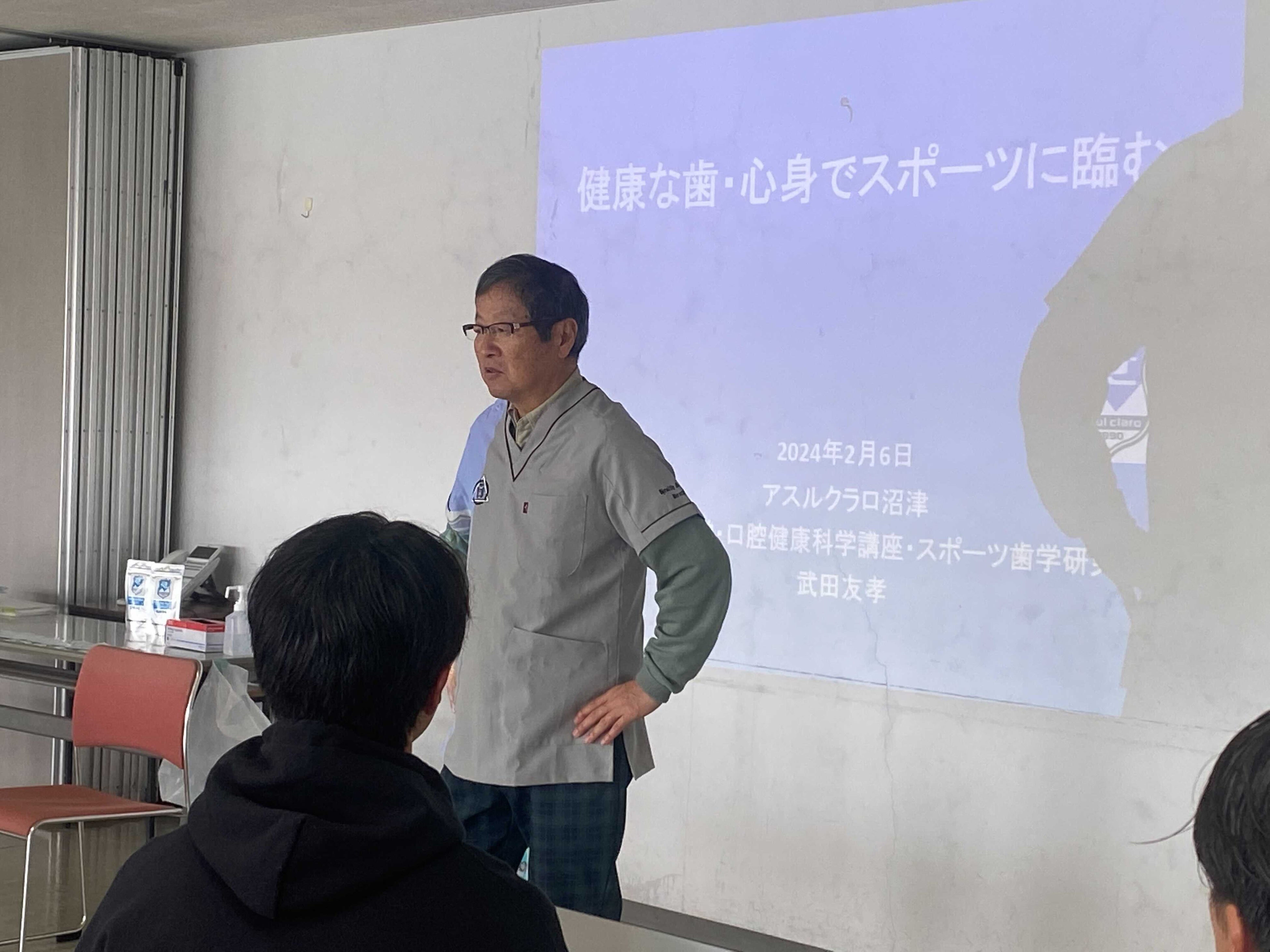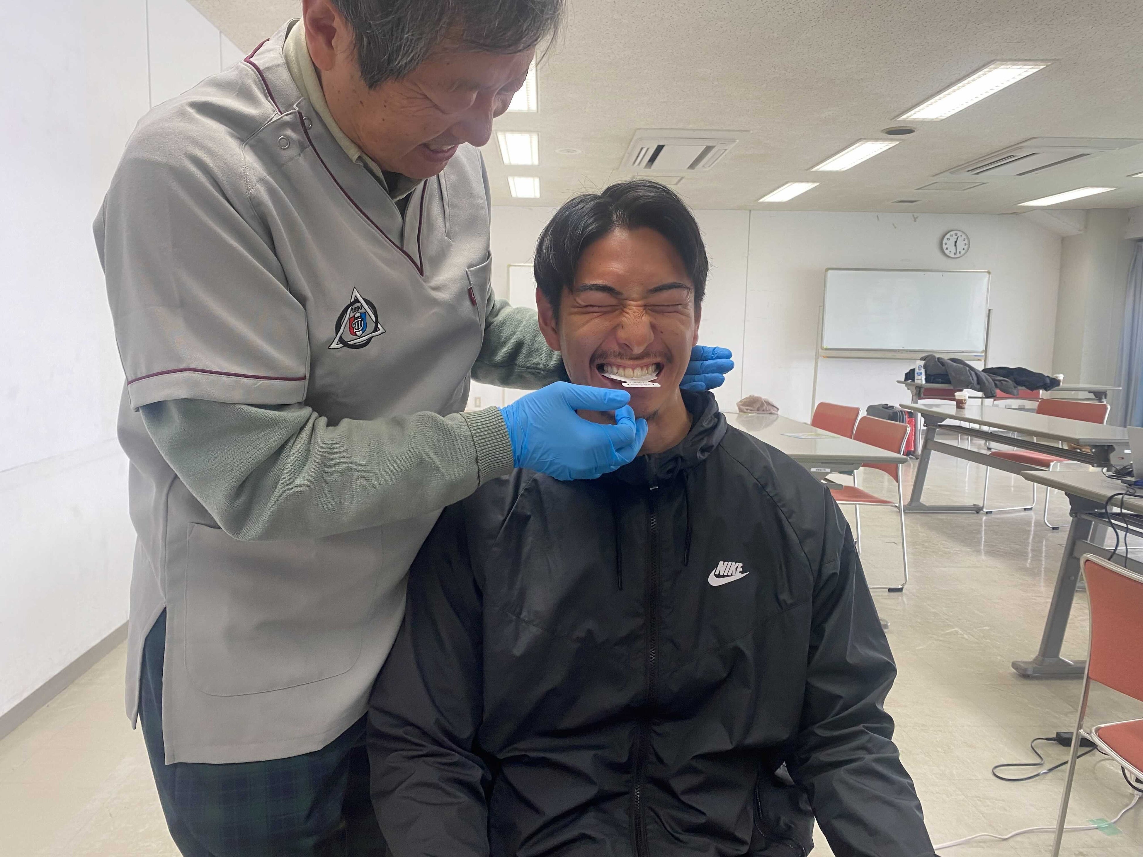 武田客員教授による口腔健康セミナーでは、「特にサッカーにおいては、キックの際等に噛みしめることにより咀嚼筋が活動し、瞬間的なパワーを効率的、効果的に発揮することにつながります。ヘディング時は、強く噛むことにより首が固定されやすく頭部のゆれが減少するため防御力も高まります。また、噛むことにより唾液の働きが活発になるため、口の健康を守るだけでなく、唾液中の免疫物質や成長ホルモン等により体の健康への影響も期待できます」といったお話がありました。津久井匠海選手は「ガム咀嚼トレーニングでスタートダッシュが速くなった研究データが1番印象的で、噛むことの重要性を身に染みて感じました。噛むことのトレーニングとしてガムを活用したいと思いますし、ガムを噛むだけでパフォーマンスアップにつながるのは手軽で良いです。セミナーに参加して噛むことの意識が高まりました。日々のトレーニングでも活かしていきたいです」といった感想をいただきました。