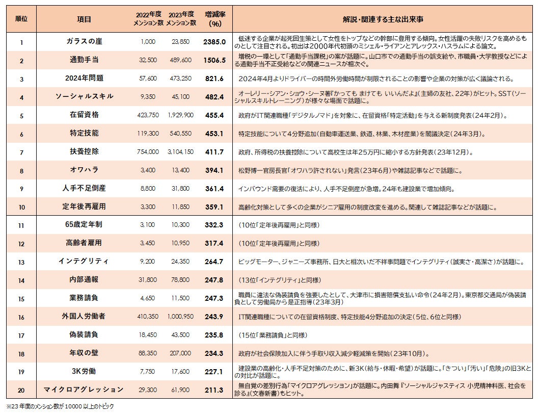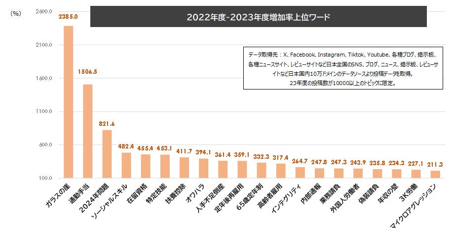 ■2023年度(2023年4月-24年3月末)における「はたらく」に関する投稿増加率ワードランキングと解説