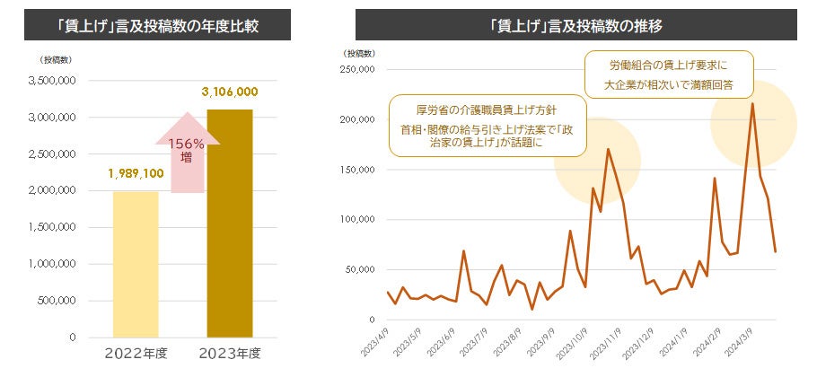 ■【ピックアップ分析】 「賃上げ」言及投稿数は22~23年度で156%増加。とりわけ23年11月、24年3月に急増