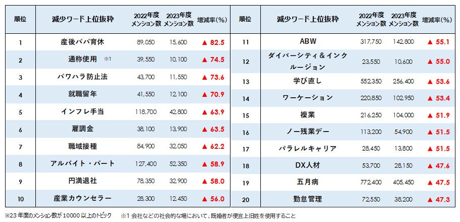 ■2023年度(2023年4月-24年3月末)における「はたらく」に関する投稿減少率ワードランキング(前年同期比)